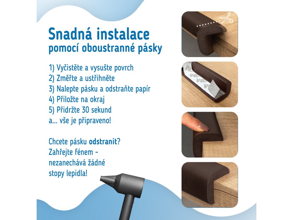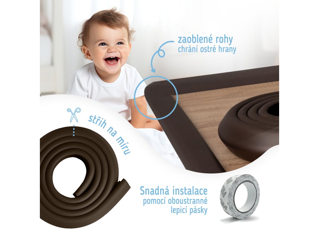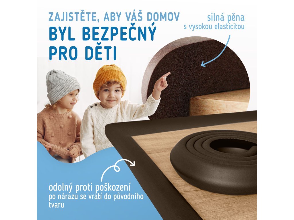 Ochranná páska je široko používaný bezpečnostný prvok vďaka materiálu a mäkkosti. Je možné ju použiť na ochranu dosiek stolov, skríň, schodov a všetkých ďalších prvkov, ktoré majú ostré hrany a mohli by tak predstavovať bezpečnostné riziko pre vaše deti.