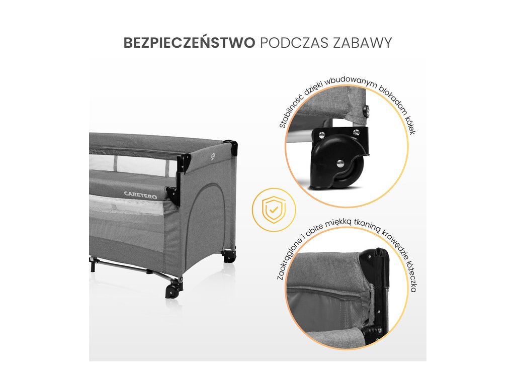 Bezpečnosť je prioritou. Zaoblené okraje a mäkké polstrovanie chránia dieťa pred nepredvídanými pádmi. Vstavané brzdy zabraňujú pohybu postieľky počas hry a poskytujú tak dodatočnú stabilitu.