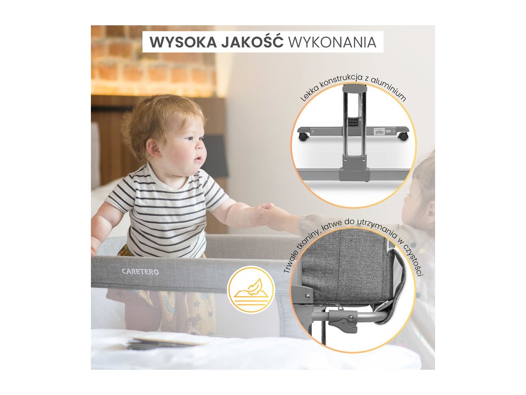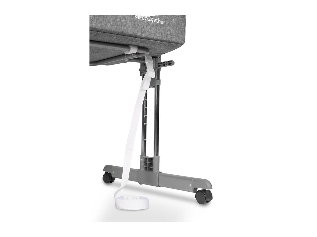 Sada obsahuje upevňovacie popruhy, ktoré upevňujú postieľku k rámu postele rodičov. Vstavané kolieska umožňujú jednoduché premiestňovanie postieľky, zatiaľ čo špeciálne zámky účinne zabraňujú akémukoľvek nechcenému pohybu počas spánku dieťaťa.