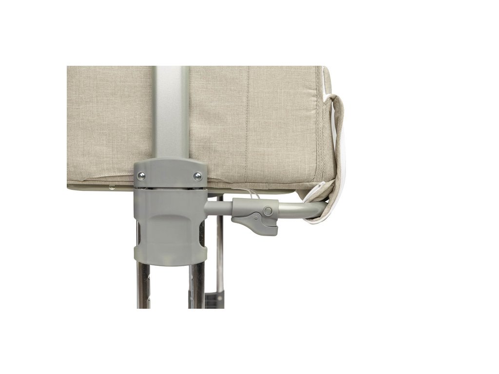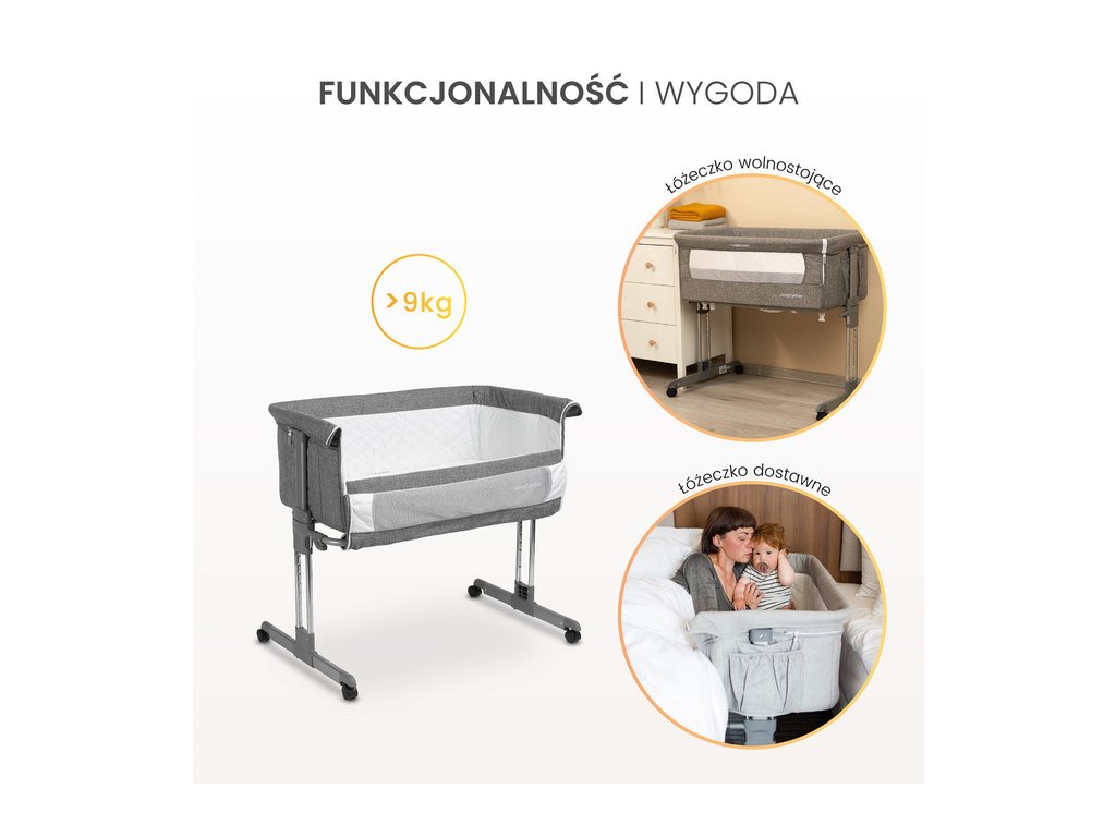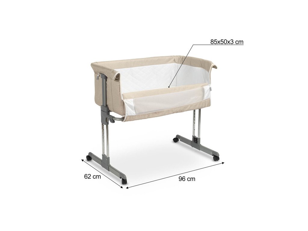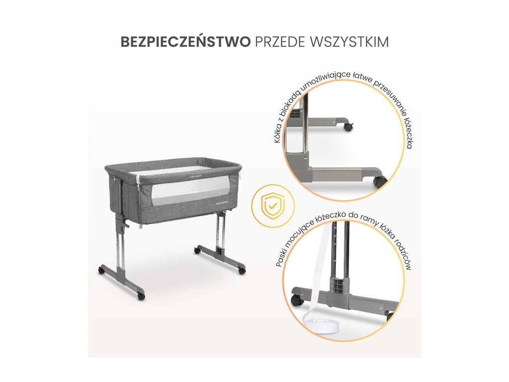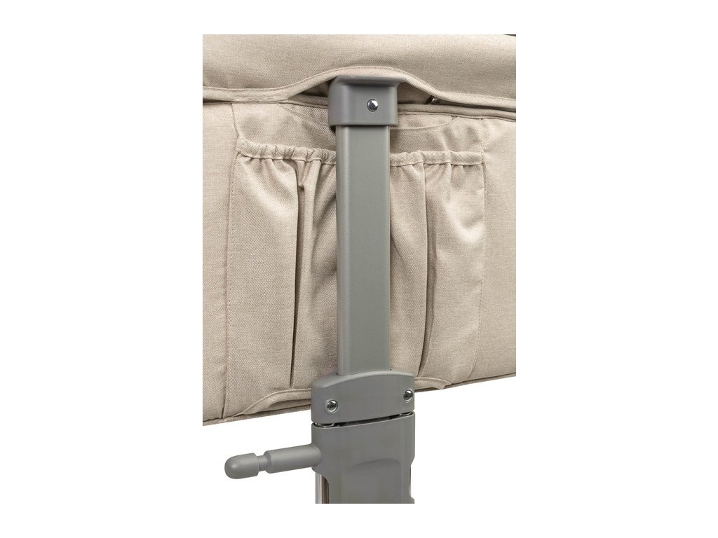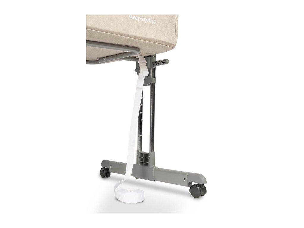 Sada obsahuje upevňovacie popruhy, ktoré upevňujú postieľku k rámu postele rodičov. Vstavané kolieska umožňujú jednoduché premiestňovanie postieľky, zatiaľ čo špeciálne zámky účinne zabraňujú akémukoľvek nechcenému pohybu počas spánku dieťaťa.