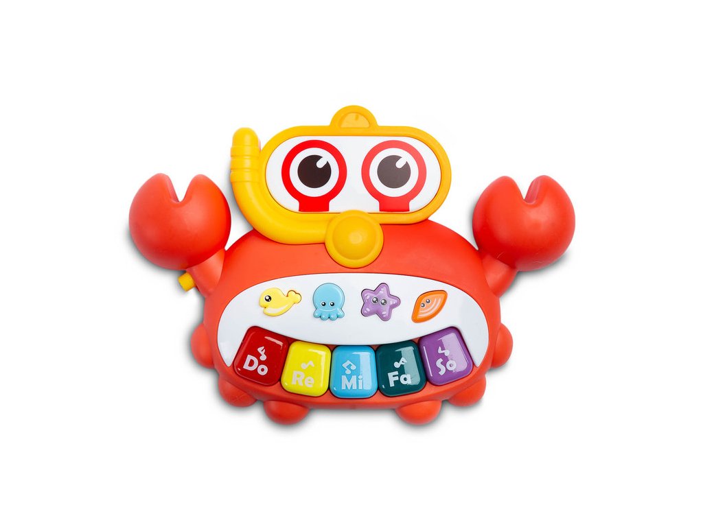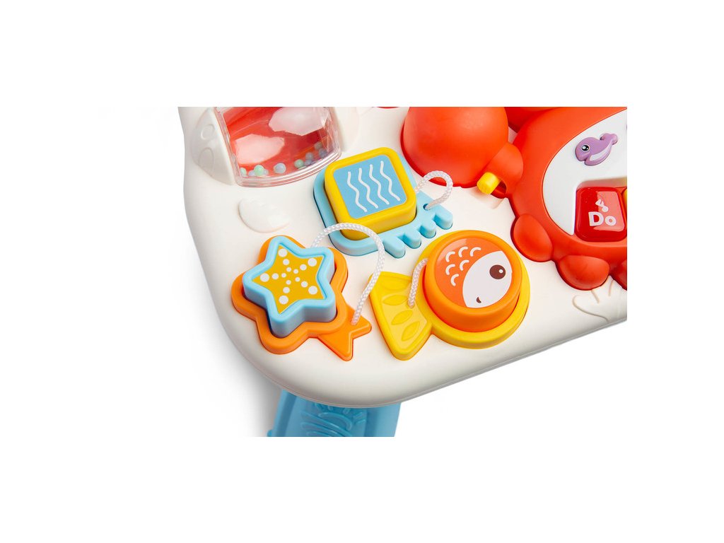 Vzdelávací panel obsahuje odnímateľný, farebný klavír v tvare kraba, pozostávajúci z farebných klávesov označených do, re, mi, fa, so. Doplnkové tlačidlá s obrázkom zvierat rozvíjajú hudobné schopnosti dieťaťa a zoznamujú ho so svetom zvukov. Košík na hranie futbalu robí produkt atraktívnejším a zabezpečuje rozvoj koordinácie dieťaťa.