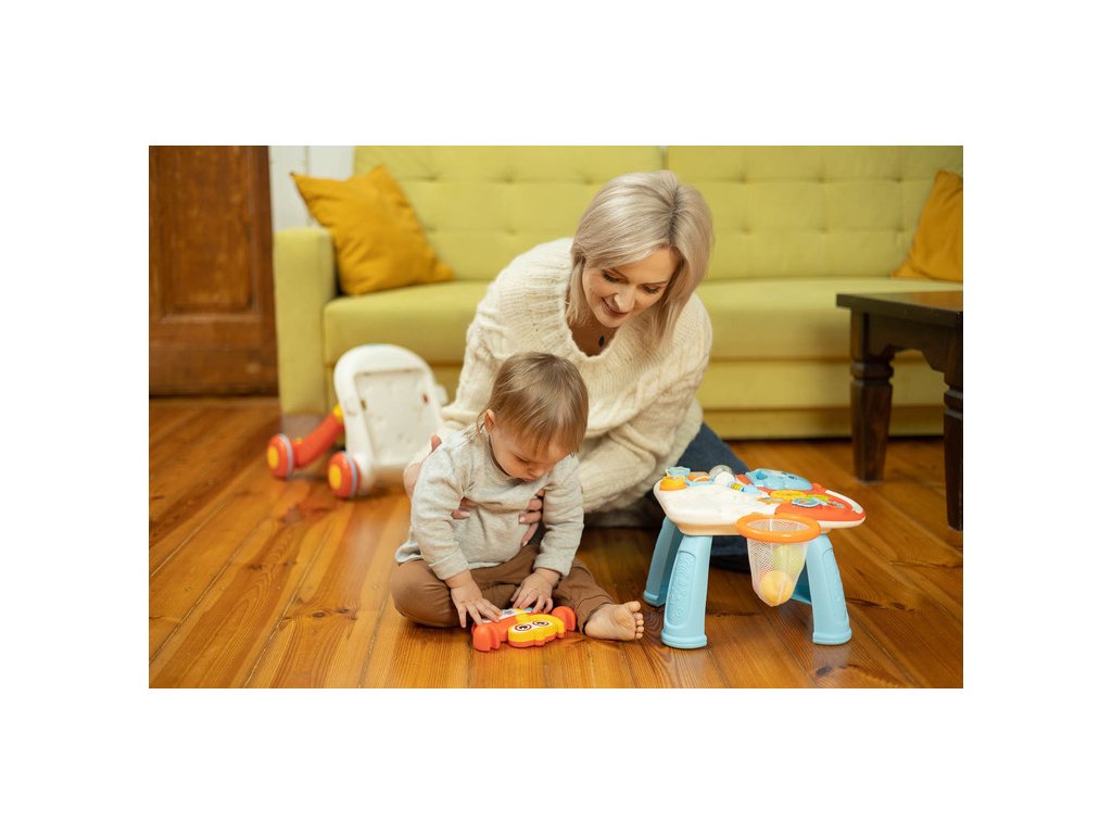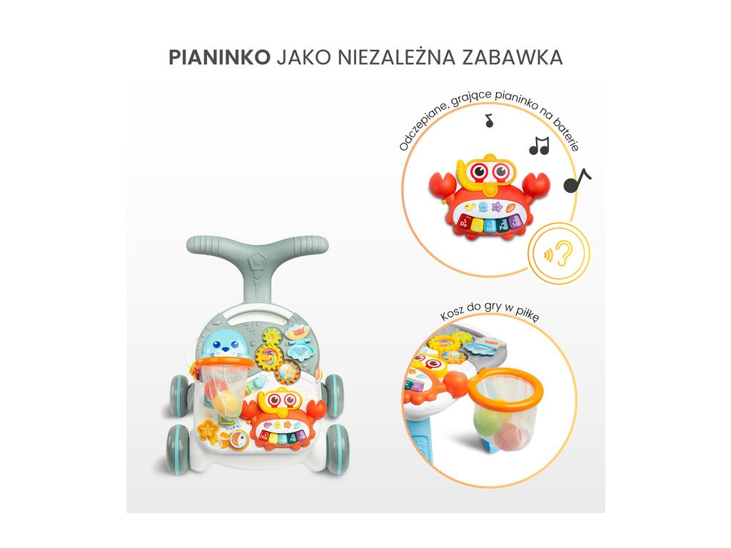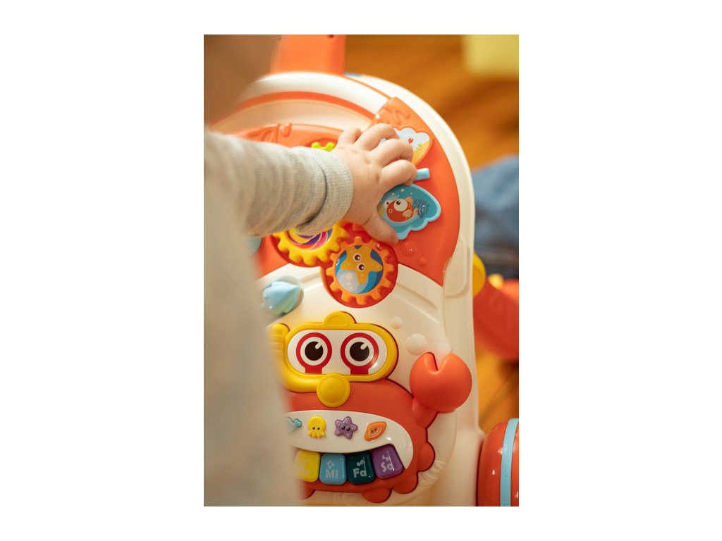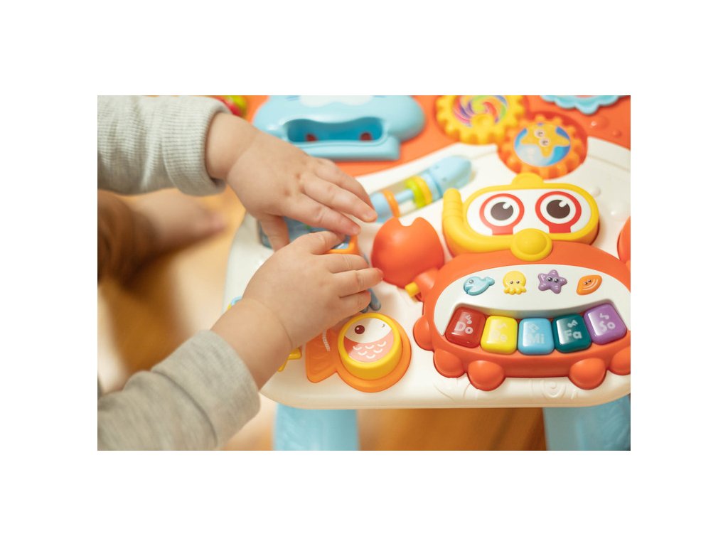 Vzdelávací panel obsahuje odnímateľný, farebný klavír v tvare kraba, pozostávajúci z farebných klávesov označených do, re, mi, fa, so. Doplnkové tlačidlá s obrázkom zvierat rozvíjajú hudobné schopnosti dieťaťa a zoznamujú ho so svetom zvukov. Košík na hranie futbalu robí produkt atraktívnejším a zabezpečuje rozvoj koordinácie dieťaťa.