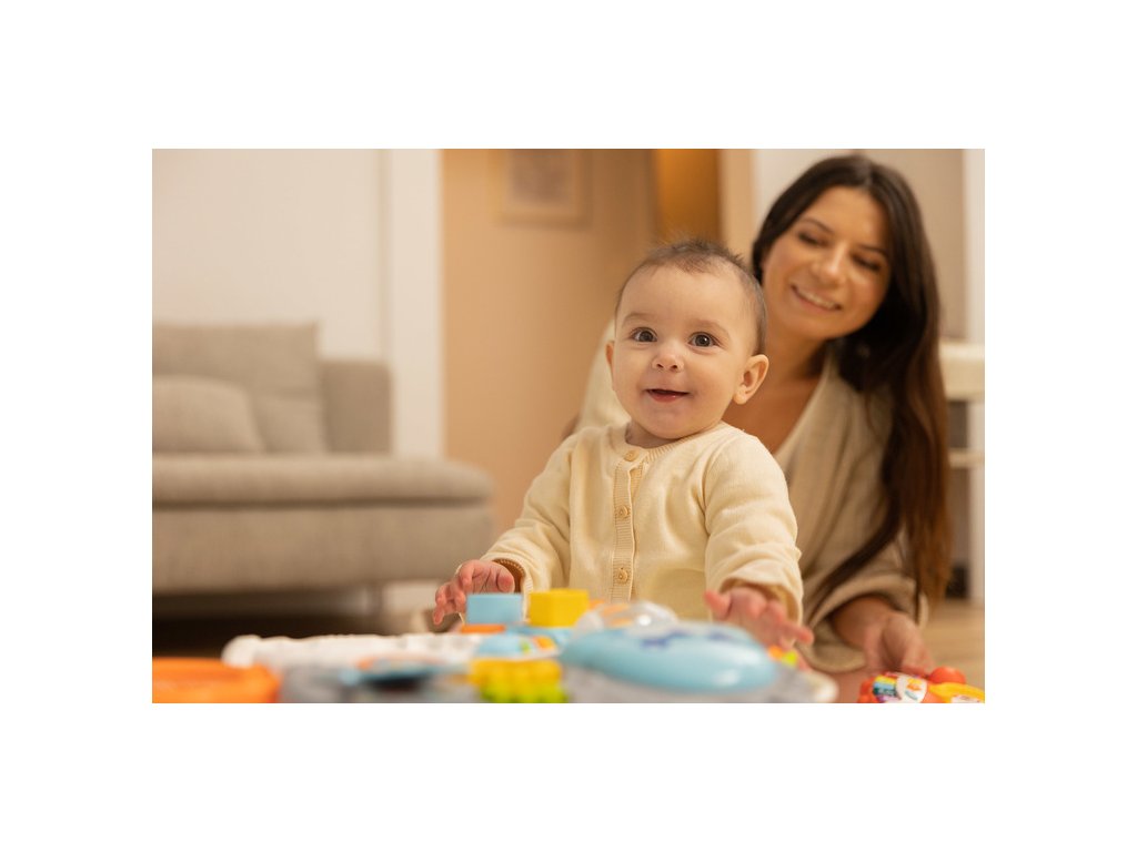 Odnímateľný vzdelávací panel ponúka množstvo interaktívnych prvkov, ako sú farebné ozubené kolesá, hryzátka a triediaci strojček s farebnými tvarmi na šnúrkach. Hračky povzbudzujú batoľa k aktivitám, ktoré rozvíjajú logické myslenie a koordináciu ruka-oko. Vďaka možnosti odpojiť interaktívny panel s hračkami ide o samostatnú hračku, ktorú si môžete vziať so sebou na výlet.