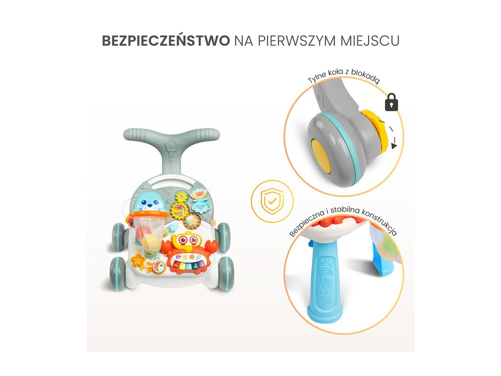 Vďaka funkcii chodítka môže bábätko bezpečne robiť prvé kroky a vstavaný vzdelávací stolík je skvelý spôsob, ako objaviť nové zručnosti. Možnosť nastaviť výšku riadidiel podľa výšky dieťaťa poskytuje väčšiu stabilitu a pohodlie pri učení sa chôdze.