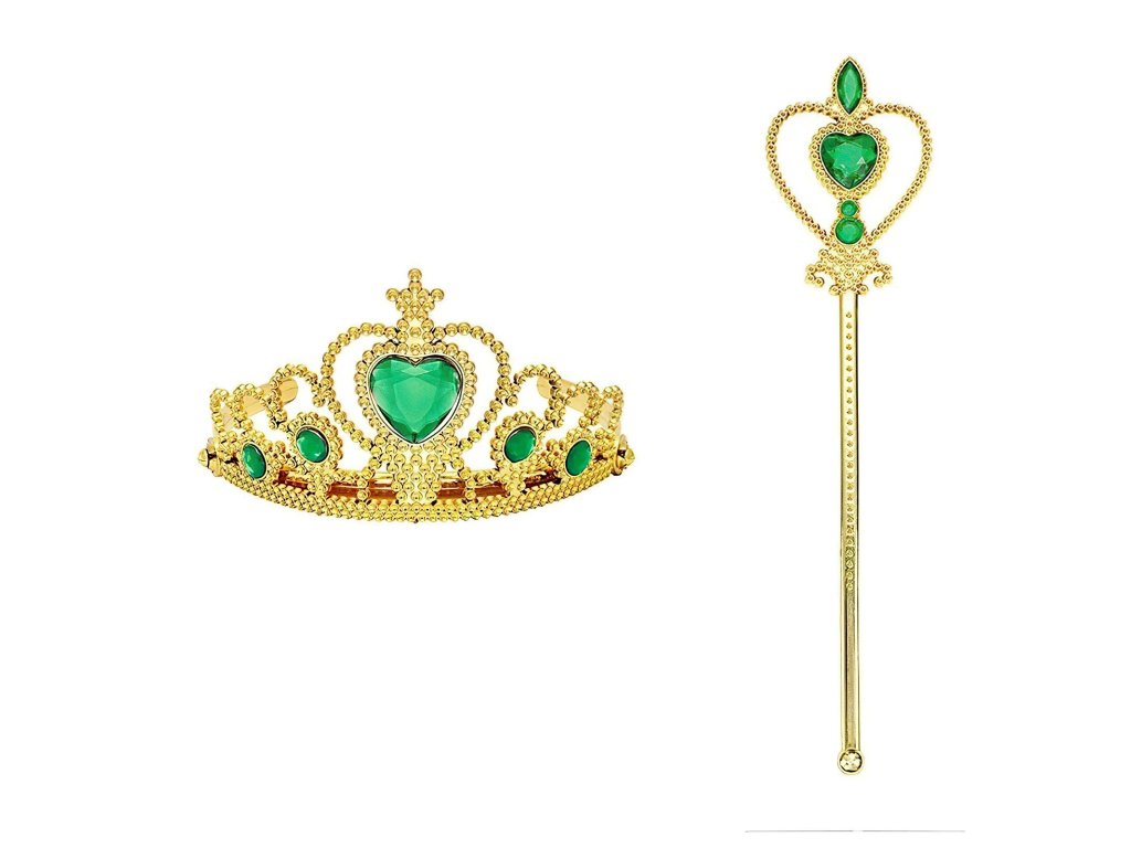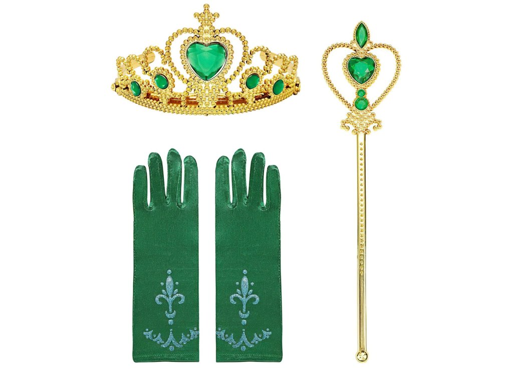 Sada obsahuje tri doplnky – zlatú korunku s tyrkysovými kamienkami, ladiacu čarovnú paličku a zelené saténové rukavice s modrým vzorom. Ozdobená korunka je vyrobená z ľahkého plastu a vďaka svojmu lesku a srdiečku uprostred pôsobí slávnostným a vznešeným dojmom. Je ideálna na detskú hlavičku, ľahko sa nasadzuje a dobre drží počas hry aj pohybu.