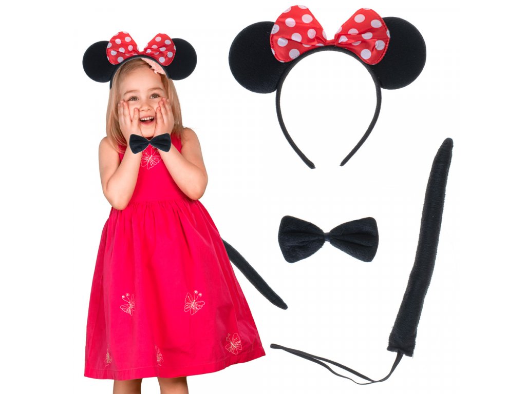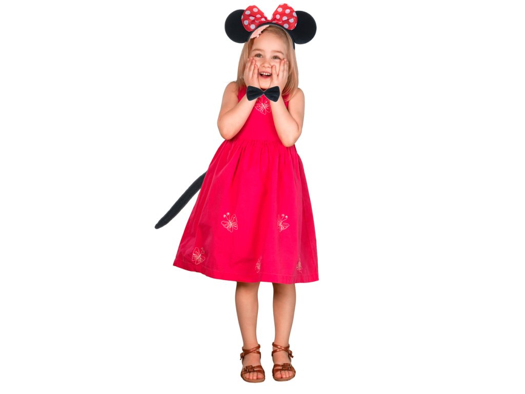 Vďaka kvalitnému spracovaniu bude vaše dieťa v tomto kostýme vyzerať a cítiť sa skvele. Súčasťou sady je čelenka s ušami a červenou mašličkou s bielymi bodkami, čierny motýlik pod krk a samozrejme chvostík. Doplnky sú vyrobené tak, aby sa dali jednoducho pripevniť na telo a ich povrch je prešívaný, aby pôsobil plasticky a naozaj. Dajte vášmu dievčatku okúsiť, aké to je premeniť sa na vysnívané rozprávkové myšky akou je aj obľúbená myška Minnie.