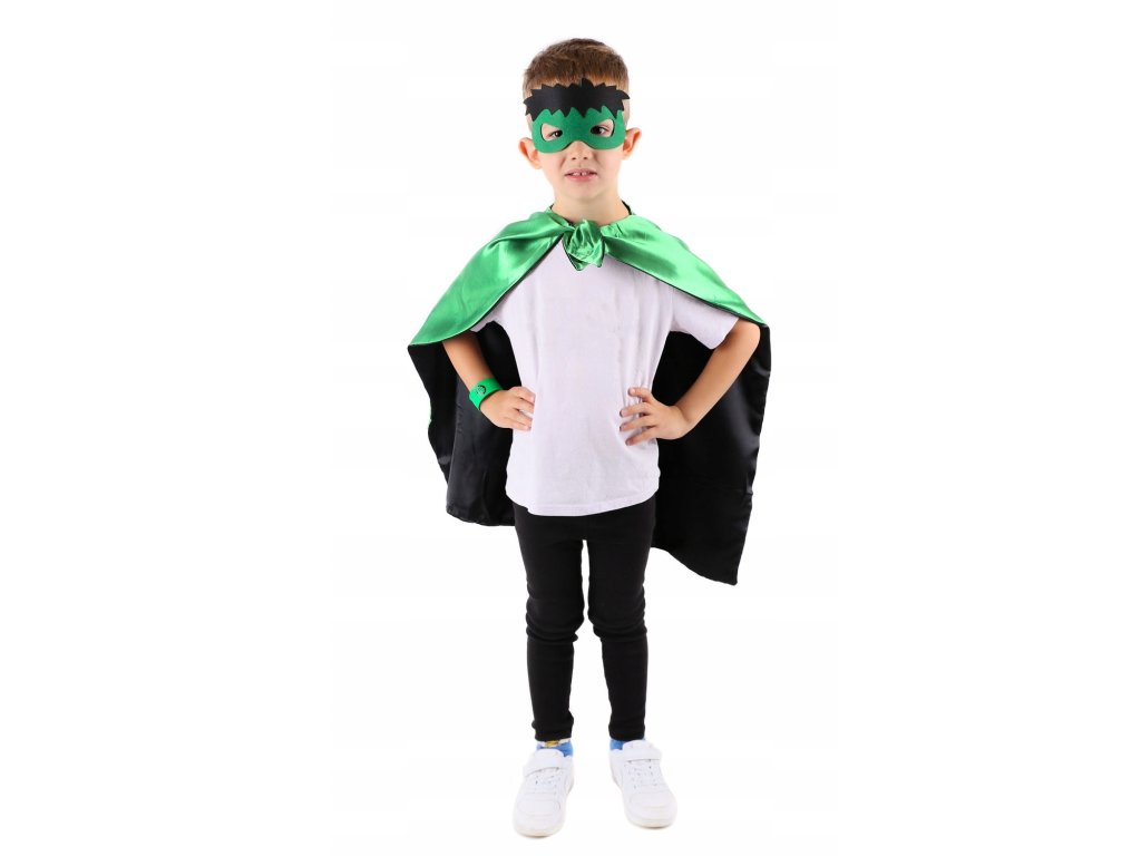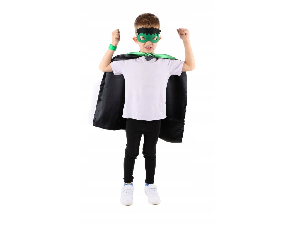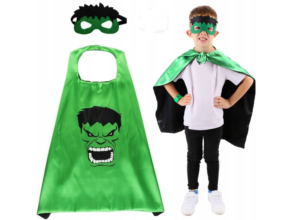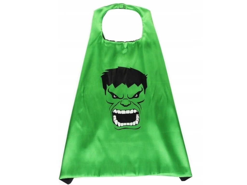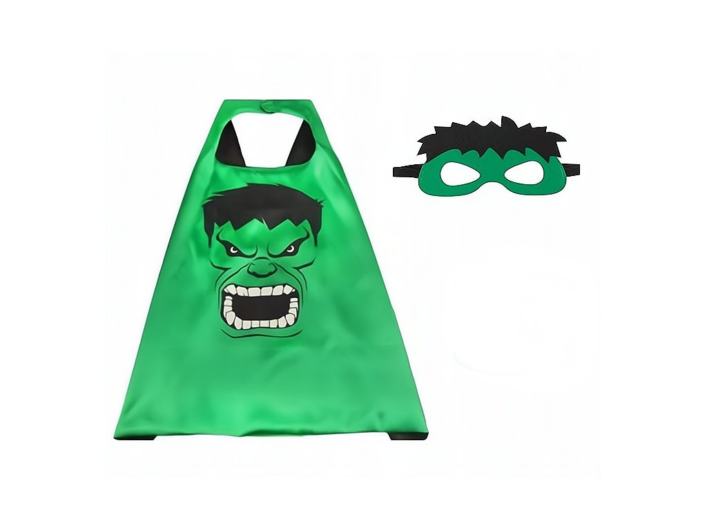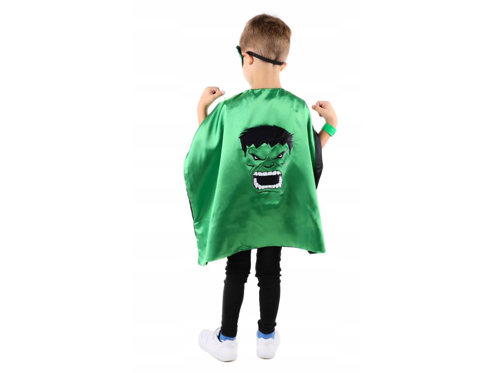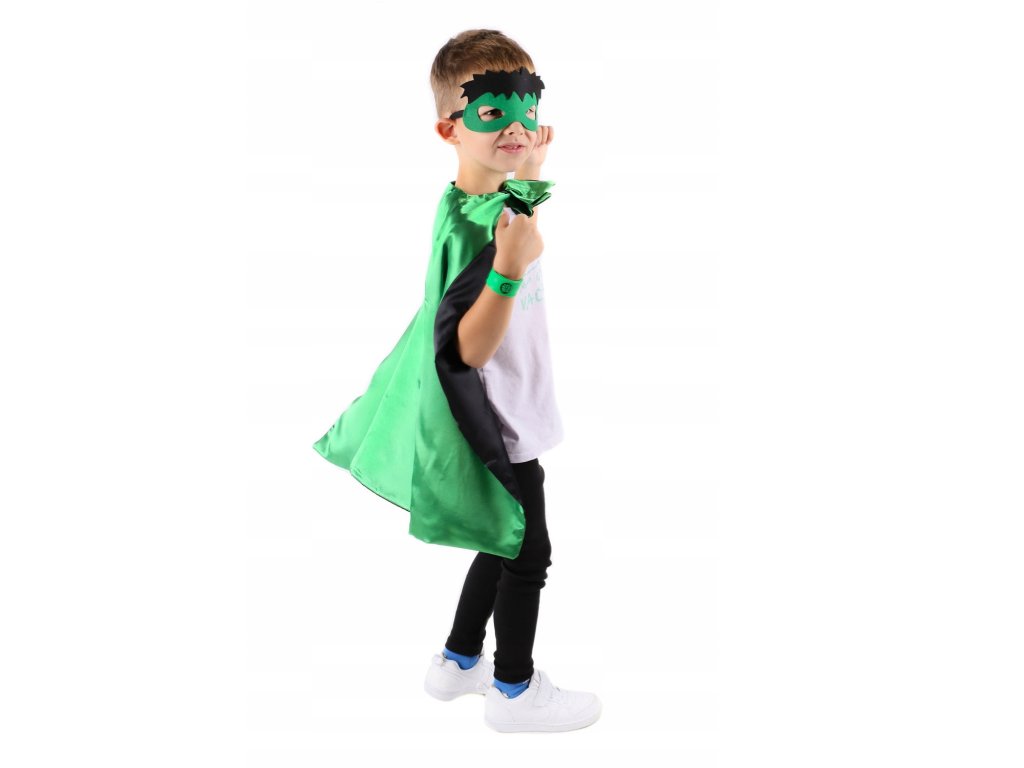 Súčasťou kostýmu je aj maska s elastickou páskou, ktorá je navrhnutá tak, aby pohodlne sedela na hlave a nešmýkala sa. Maska pridáva kostýmu autentickosť a umožňuje deťom úplne sa vžiť do role Hulka. Vďaka univerzálnej veľkosti a elastickému prevedeniu je kostým vhodný pre deti rôznych vekových kategórií. Plášť má vnútornú stranu čiernu, čo dodáva kostýmu zaujímavý kontrast a zároveň zachováva typický „hulkovský“ zelený vzhľad.