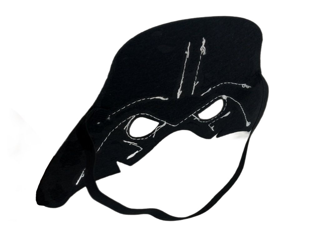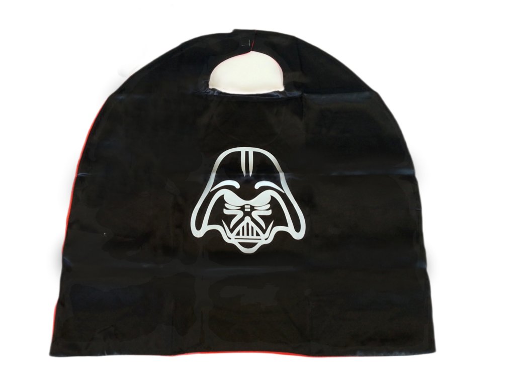 Súčasťou balenia je čierny plášť s výraznou bielou potlačou Darth Vaderovej helmy a ladiaca maska na tvár. Plášť má z vnútornej strany červenú podšívku, ktorá dodáva kostýmu kontrastný efekt a pôsobivý vzhľad. Zapínanie za krkom je na suchý zips, takže sa ľahko oblieka aj vyzlieka.