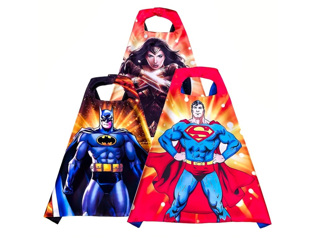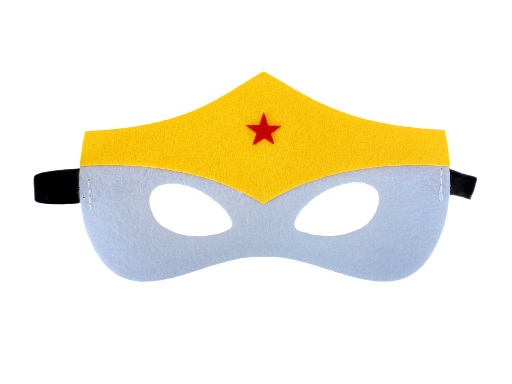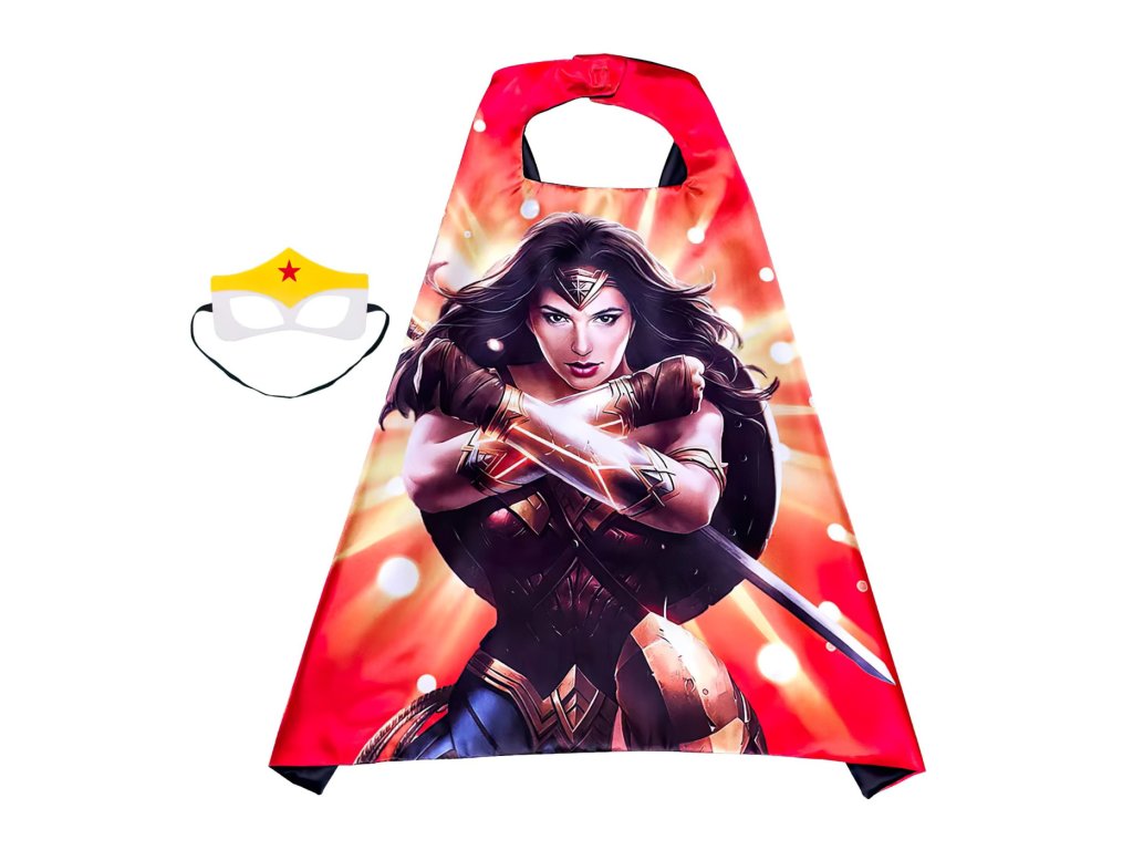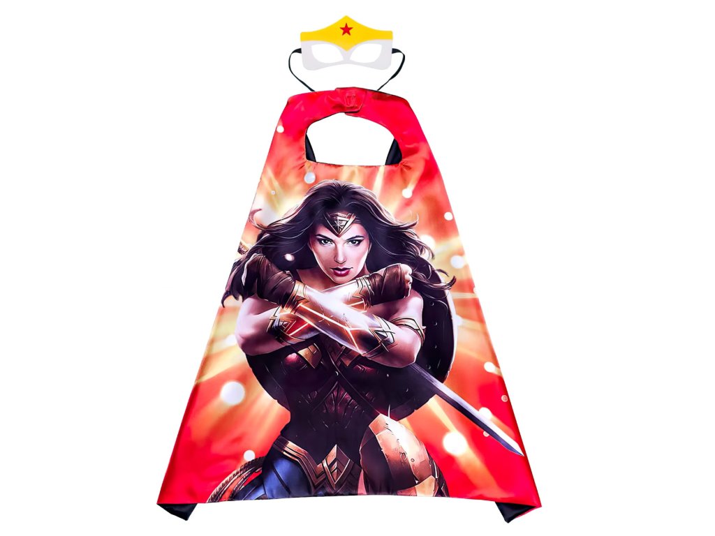 Súprava zahŕňa výrazný plášť s realistickou potlačou Wonder Woman v bojovej póze a štýlovú žlto-bielu masku so symbolom hviezdy, ktorá podčiarkuje celkový hrdinský vzhľad.