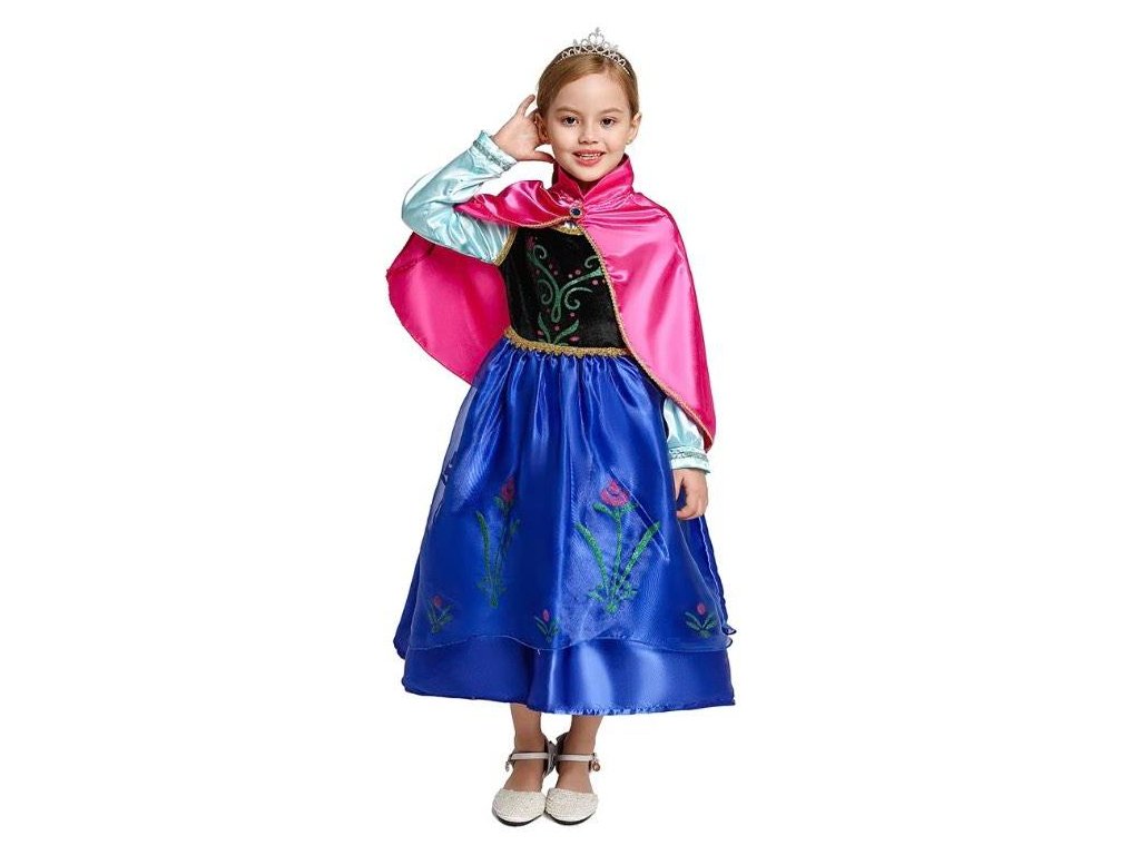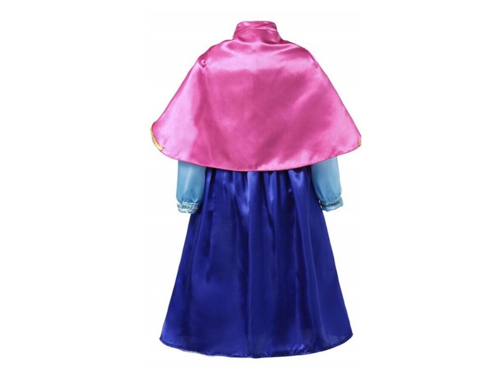 Detský karnevalový kostým Anna Frozen, jednej z hlavných hrdiniek Ľadového kráľovstva. Sukňa kostýmu je v krásnych pestrých farbách s vyšívanými motívmi. Doplnkom šiat je jemná pelerína so zapínaním pri krku. Modrá lesklá sukňa je v páse nariasená do gumičky s ozdobným zlatým lemom. Dlhé rukávy sú hladké a ľahké - dotvoria celkový vzhľad a zaručia pôvab každej malej princeznej. Zažite mágiu s kúzelným detským karnevalovým kostýmom Anny z filmu Ľadové kráľovstvo.