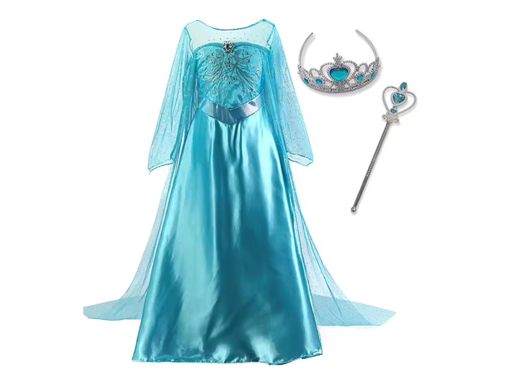 Kostým zahŕňa nádherné saténové šaty v tyrkysových modrých tónoch, ktoré žiaria a pripomínajú ľadové kráľovstvo. Šaty sú zdobené jemnými detailmi, ako sú flitre a kamienky alebo brošňa na prsiach, ktoré pridávajú na elegancii. V páse je všitá pružná gumička, aby boli šaty pohodlné a dobre padli každej postave. Dlhé rukávy sú vyrobené z priehľadnej látky, čo dodáva šatám vzdušný a ľahký vzhľad.