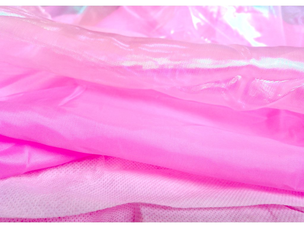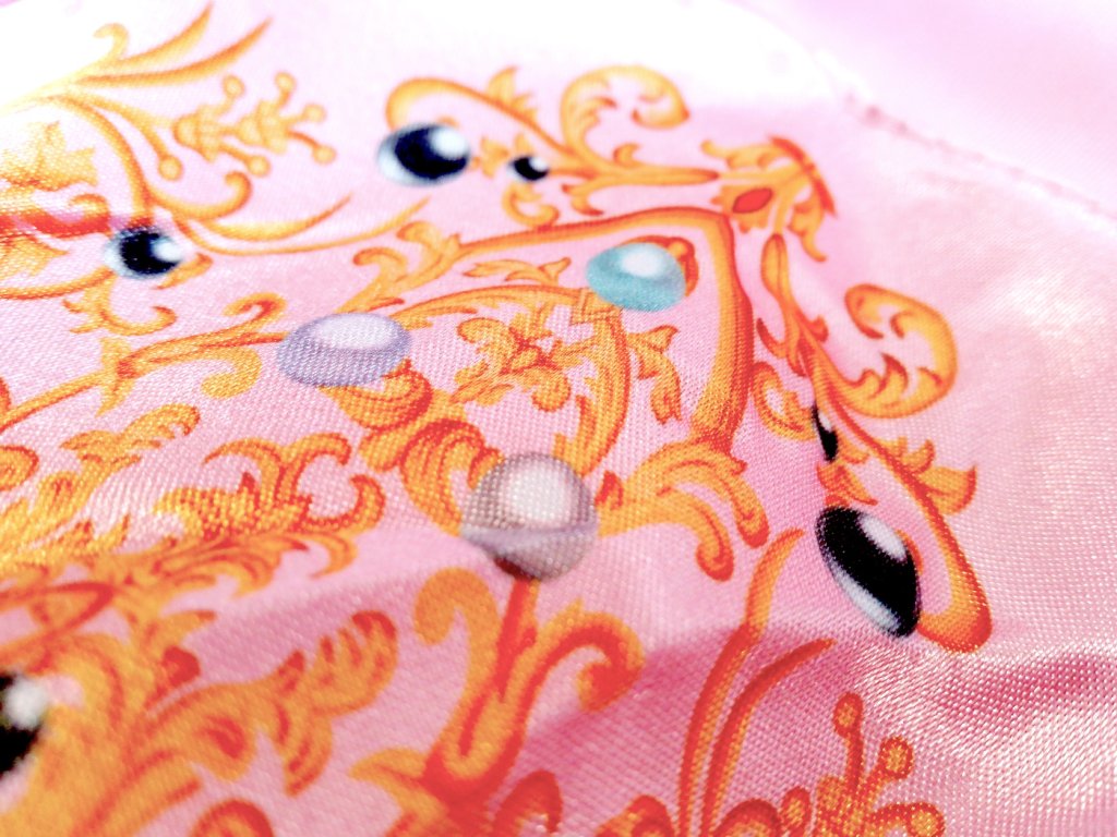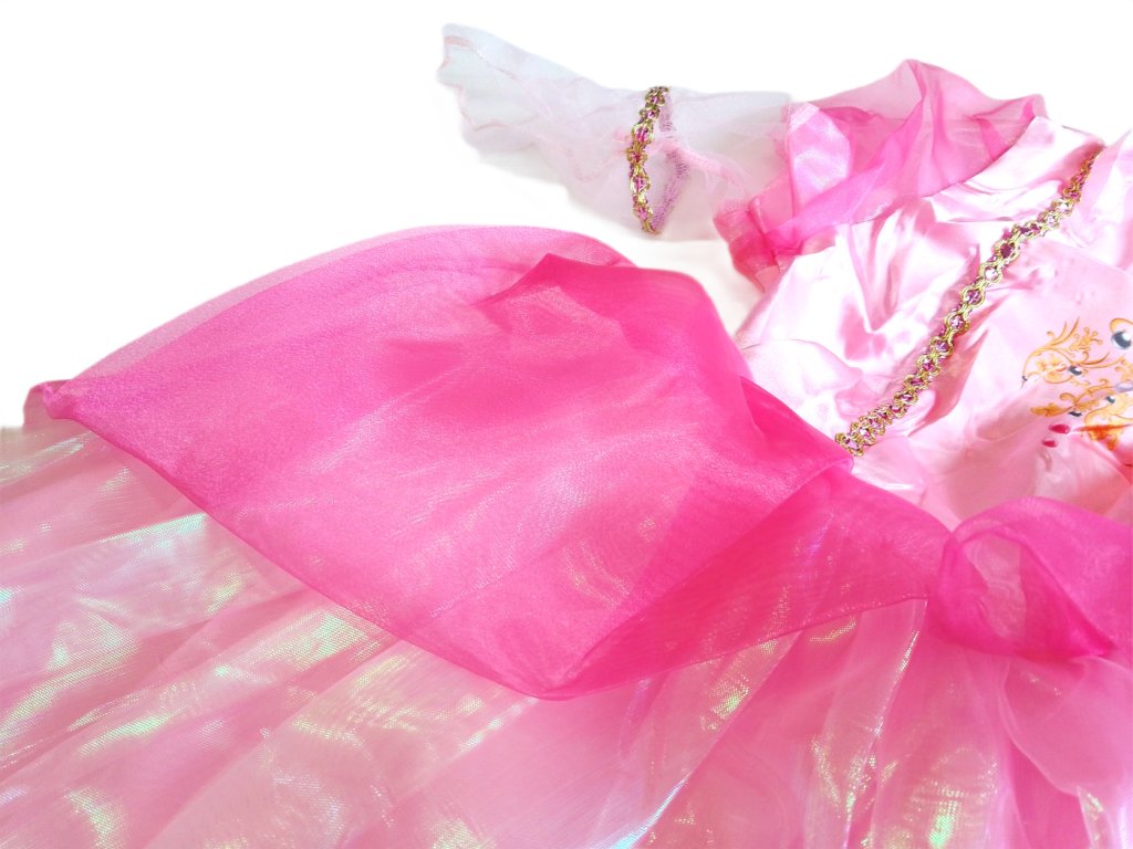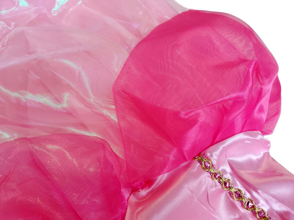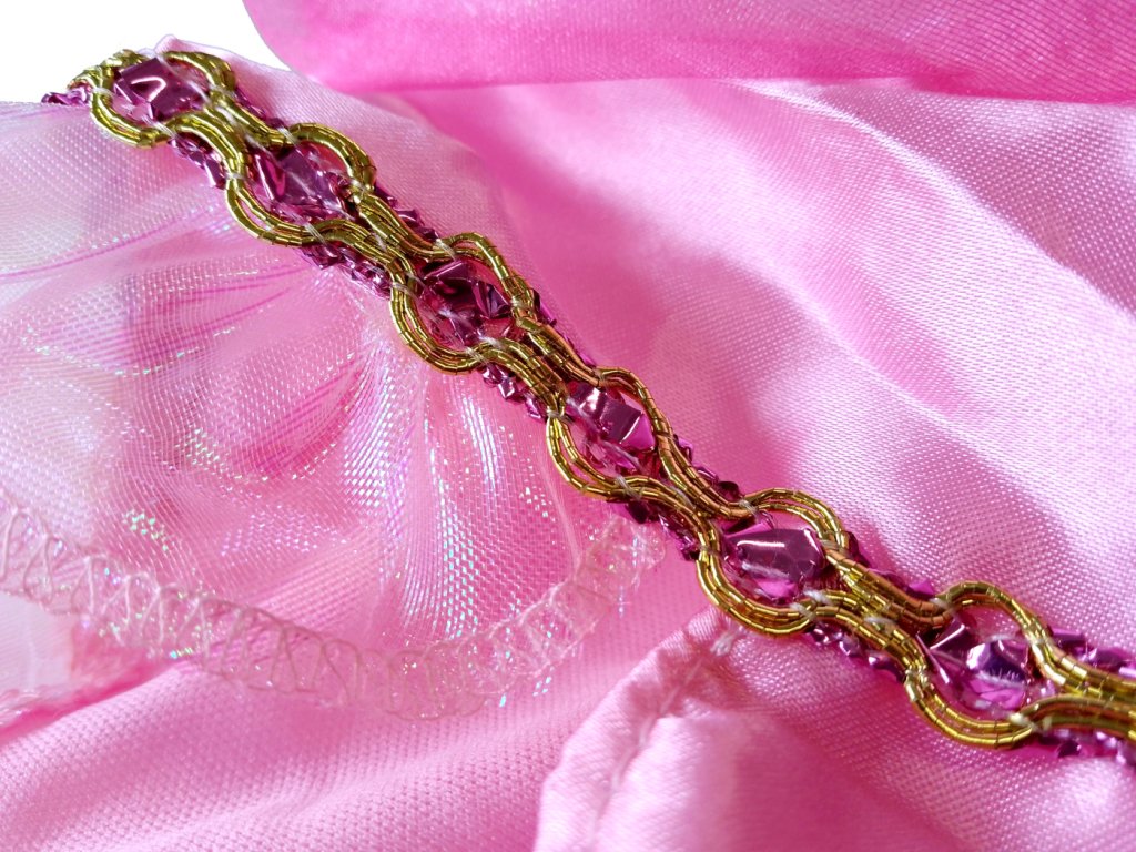 Vrchný diel šiat je vyrobený z lesklej látky v ružových odtieňoch a zdobený trblietavými detailmi, imitáciou šperkov a jemnými čipkami. Nadýchané rukáviky a živôtik dopĺňa saténový pás a dekoratívne prvky, ktoré šatám dodávajú elegantný vzhľad. Všetko je navrhnuté s ohľadom na pohodlie pri nosení.