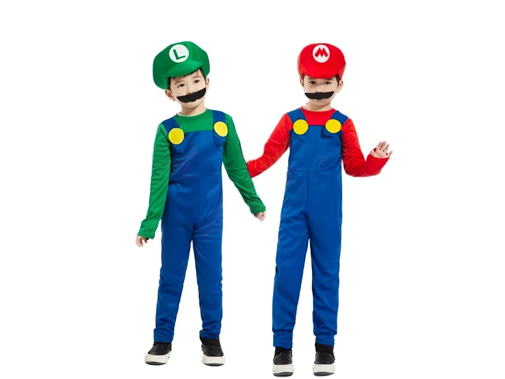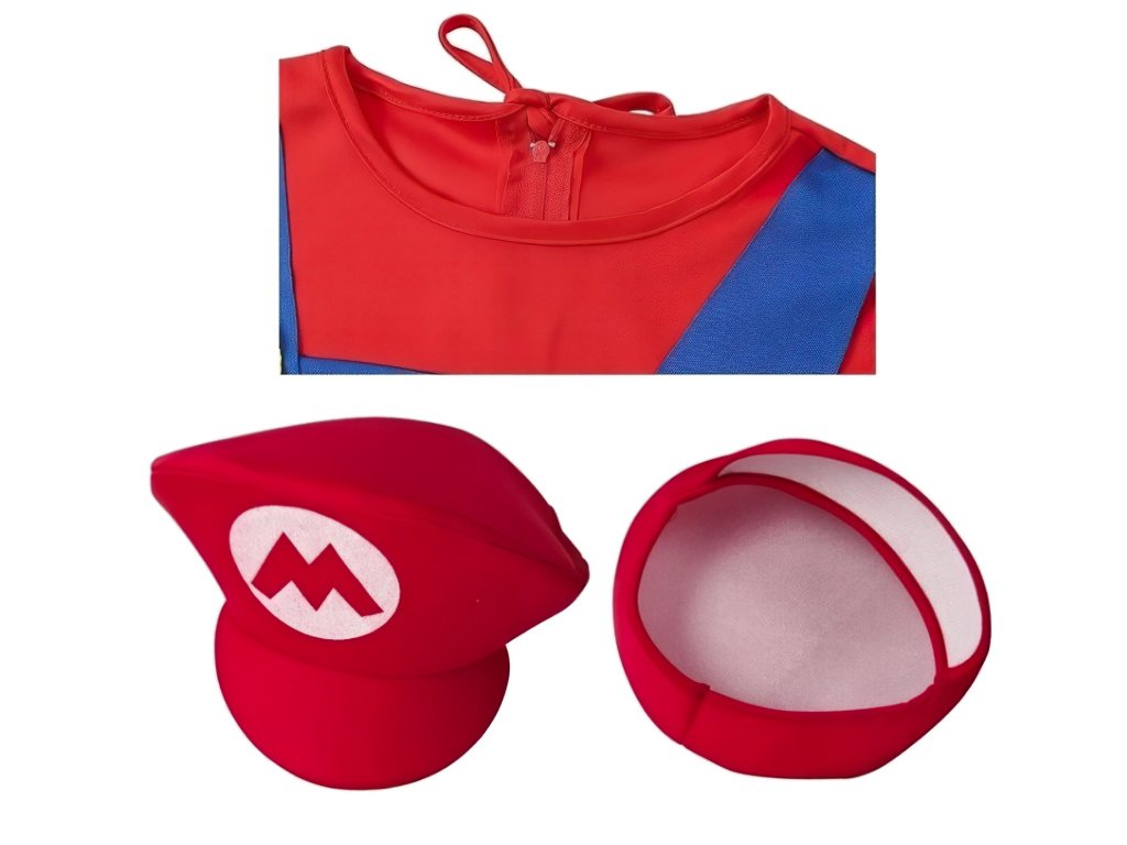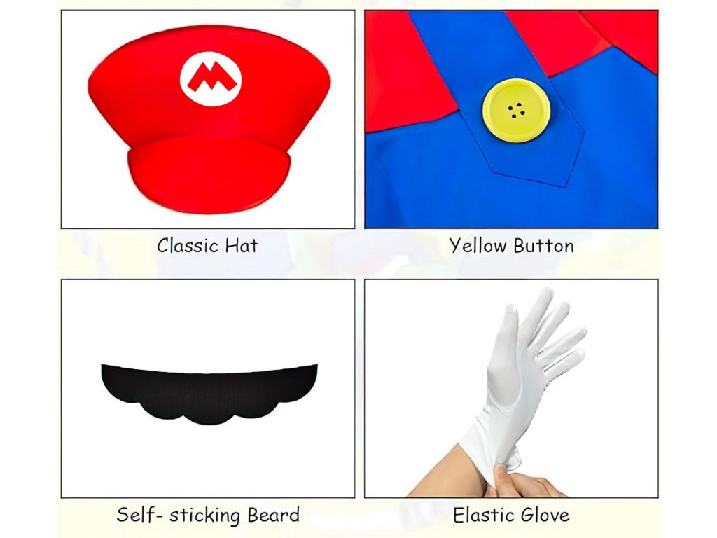 Tento kostým prináša perfektnú kombináciu farieb a detailov, vďaka ktorým sa vaše dieťa premení na skutočného Maria. Skladá sa z overalu s dizajnom modrých nohavíc s trakmi so žltými gombíkmi a červeného trička, červenej čiapky s charakteristickým „M“, bielych rukavíc a čierneho nalepovacieho fúzika, ktoré spolu tvoria kompletný a autentický vzhľad.