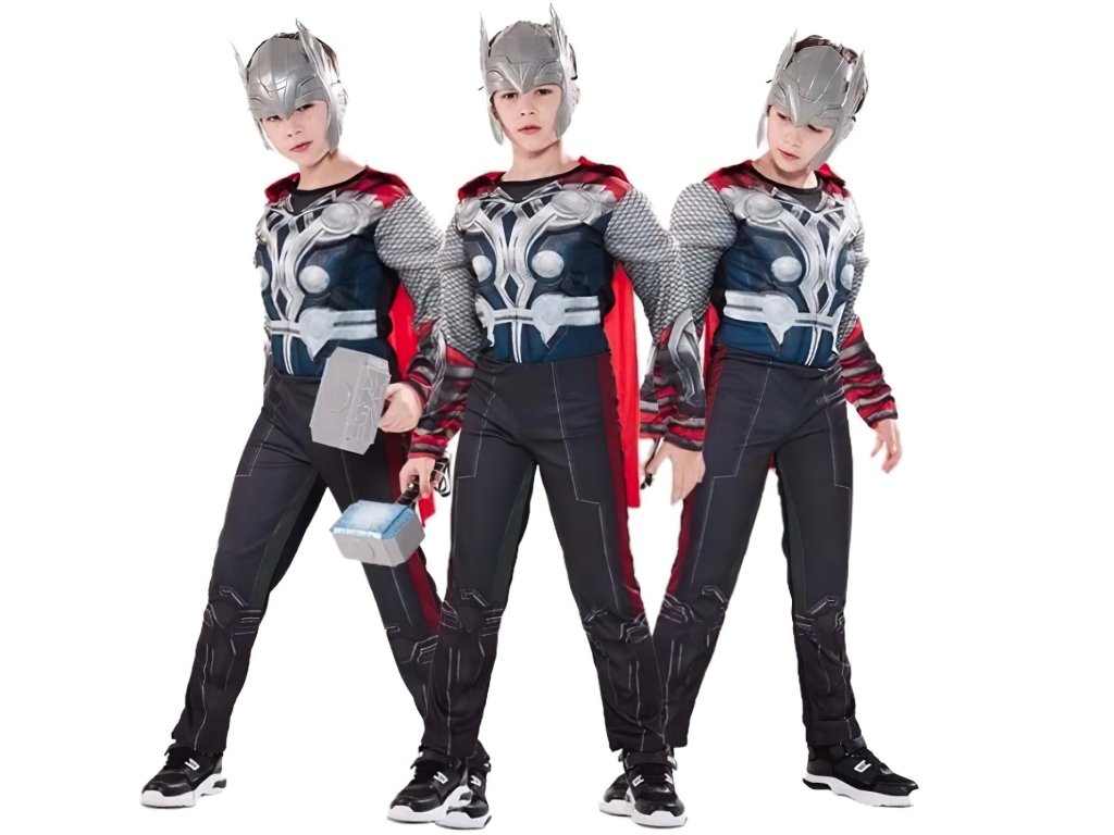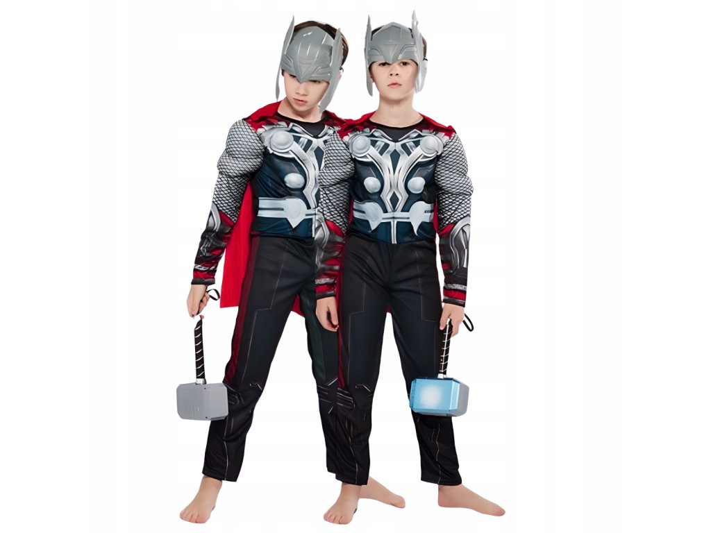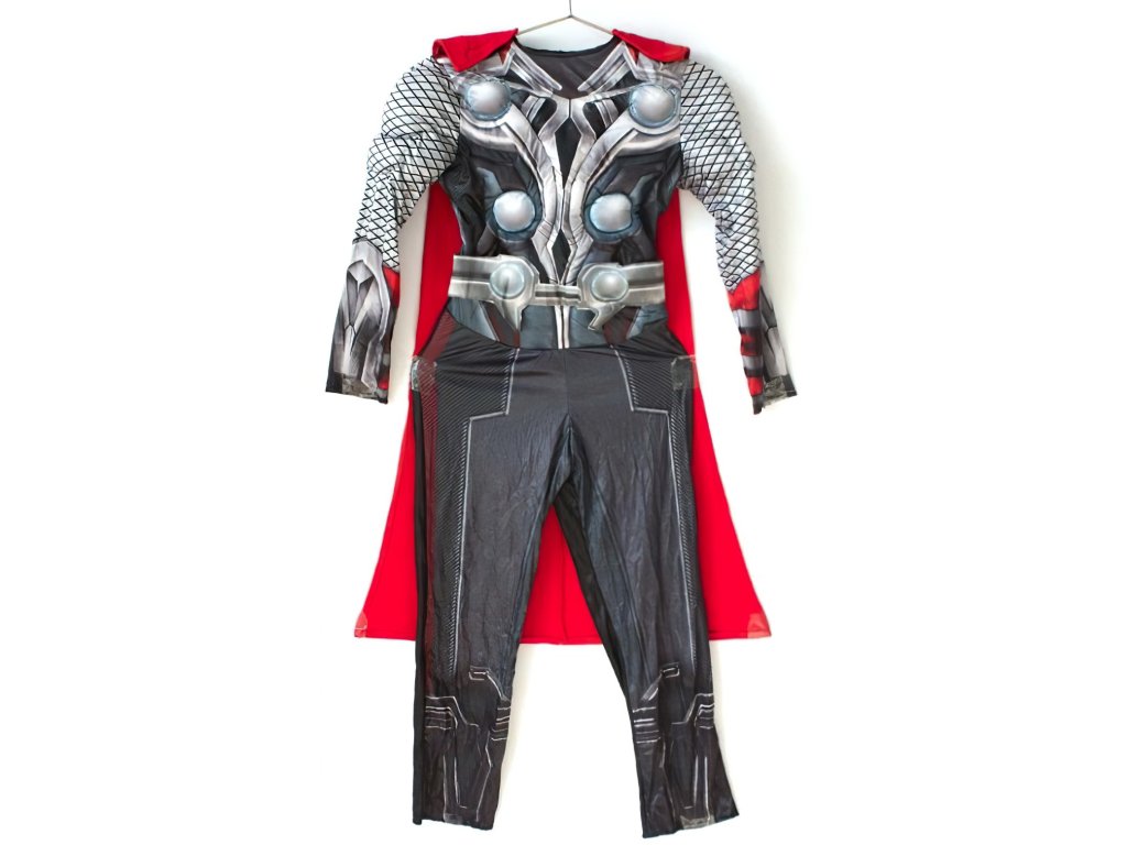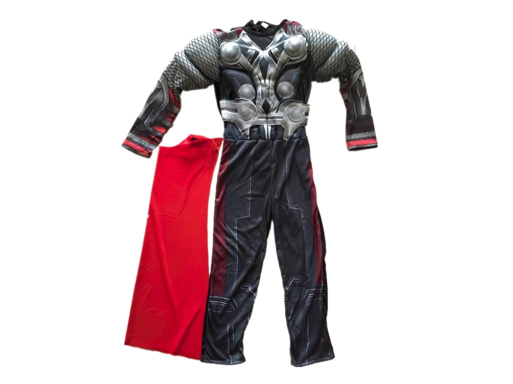Kostým sa vyznačuje autentickým vzhľadom, ktorý verne napodobňuje ikonický oblek Thora, ako ho poznáme z filmov a komiksov. Súčasťou kostýmu je čierny overal s detailnou potlačou, ktorá simuluje Thorovu brnenie a jeho slávny červený plášť, ktorý dotvára celkový vzhľad mocného bojovníka. Overal má pružnú gumičku v páse, aby bol pohodlný pre rôzne typy postáv. Zapínanie je riešené zipsom v zadnej časti a elastickými šnúrkama za krkom. Hrudná časť a ramená sú vyplnené pre reálny dojem svalov a tam kostým pôsobí 3D dojmom a skvele padne. Plášť sa jednoducho prichytí okolo krku pomocou suchého zipsu.