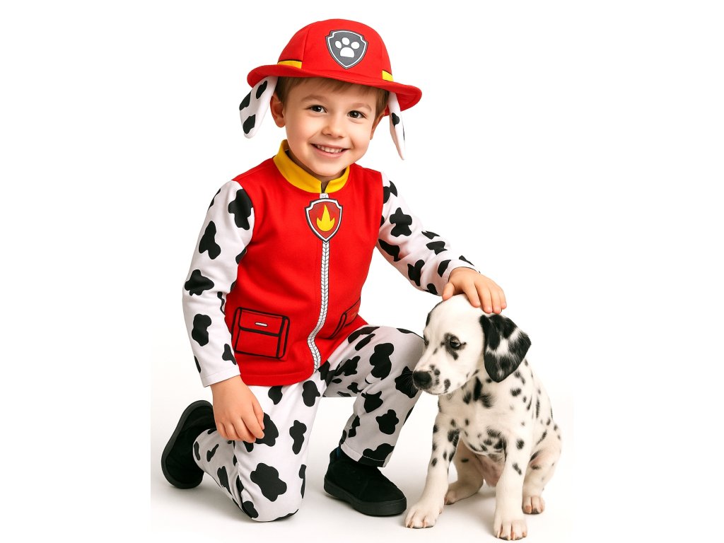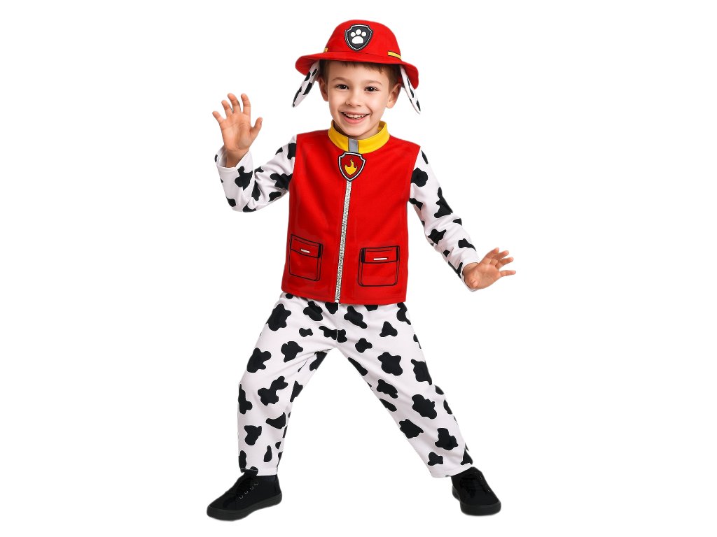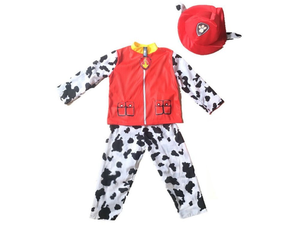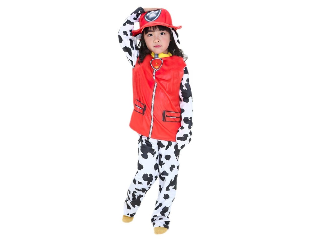 Súčasťou kostýmu je červená vesta s výšivkou ohnivého znaku, ktorý symbolizuje Marshallovu hasičskú rolu. Rukávy a nohavice sú vyhotovené v čiernobielom vzore dalmatínca, ktorý je nielen štýlový, ale aj veľmi pohodlný. Nechýba ani červený klobúk s uškami, ktorý dodáva celému prevleku hravosť a autentickosť.