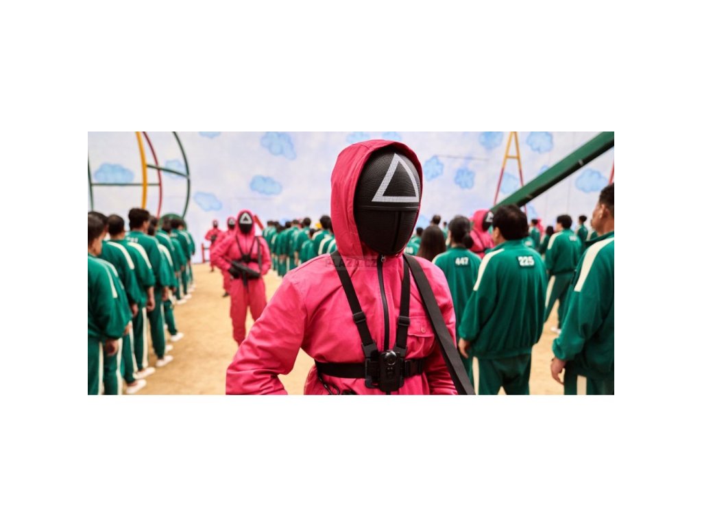 Predstavujeme kostým strážcu zo svetoznámeho seriálu „Squid Game“, ktorý vás okamžite prenesie do atmosféry napínavej hry plnej skúšok odvahy a prežitia.