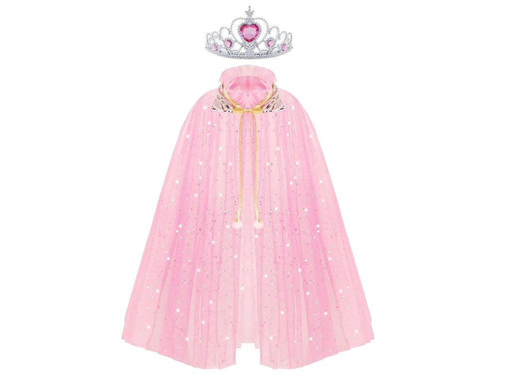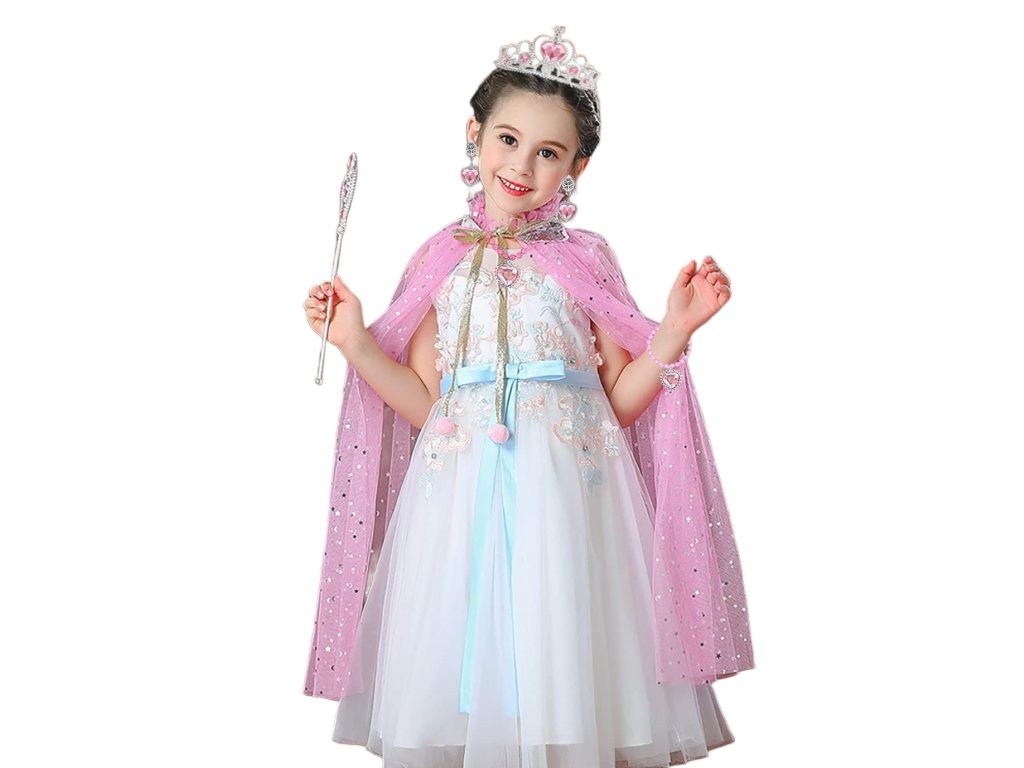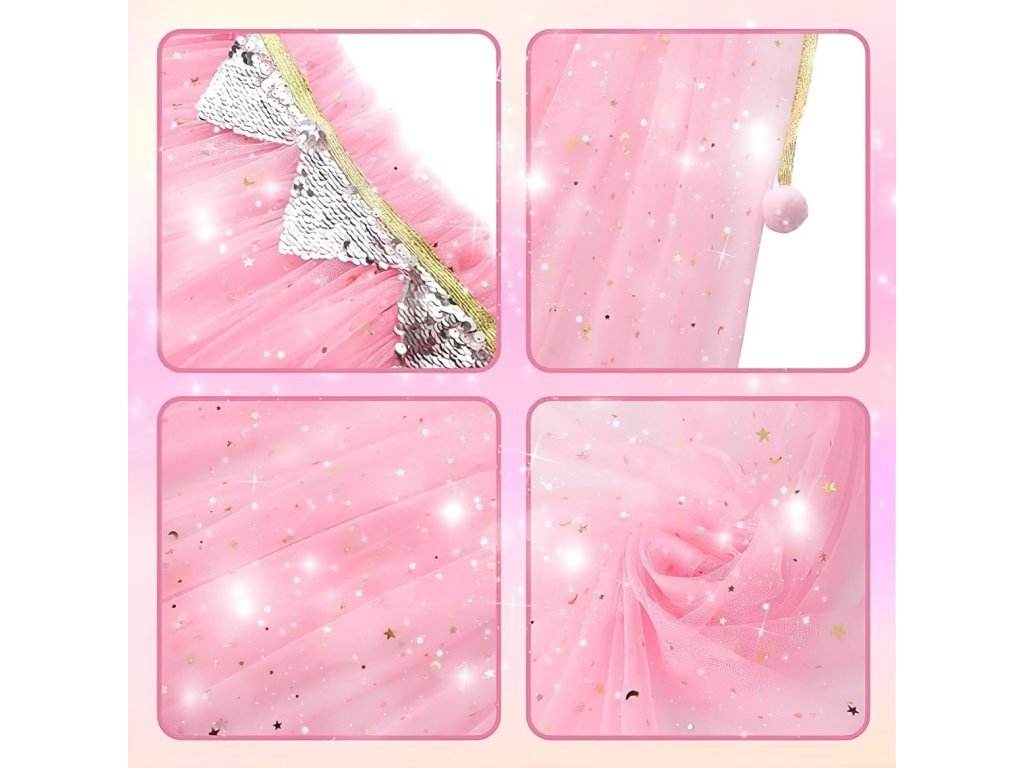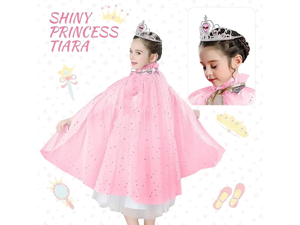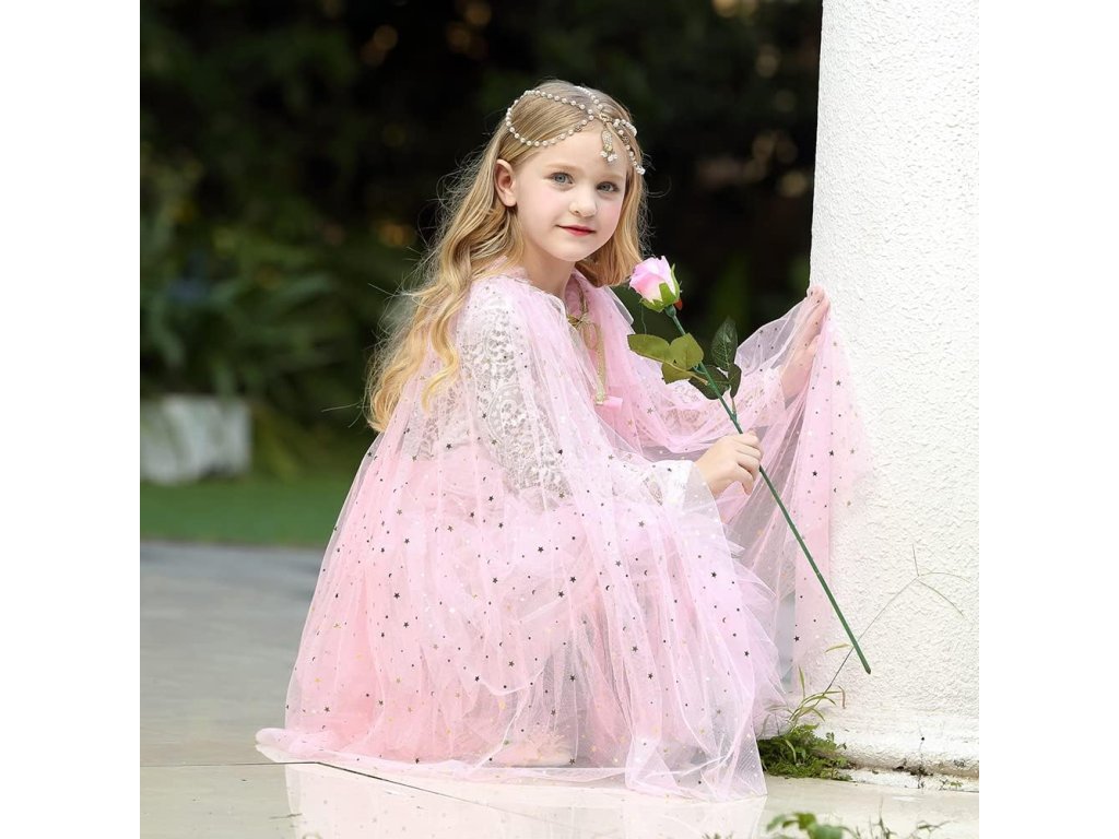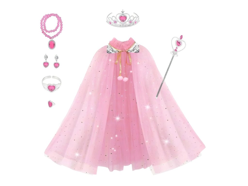 Táto očarujúca ružová súprava s plášťom, šperkami a doplnkami je ideálna pre každú malú princeznú, ktorá sníva o kúzelnom svete rozprávok. Ľahký ružový plášť z tylu je posiaty trblietavými flitrami a zakončený elegantnou mašličkou so zlatou šnúrkou a bambuľkami. Materiál je vzdušný, príjemný na nosenie a skvelý na karnevaly alebo detské oslavy.