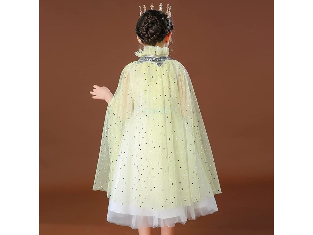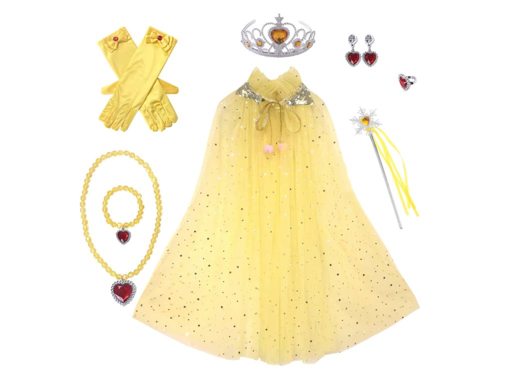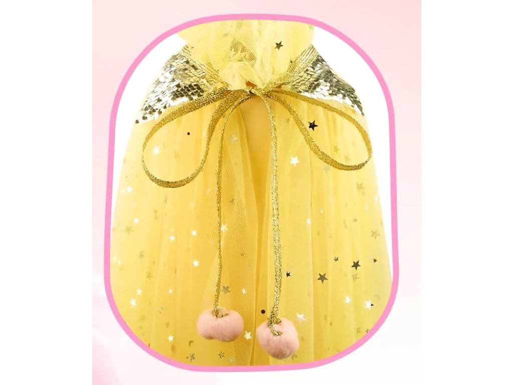 Premeníte sa na očarujúcu princeznú s touto nádhernou súpravou, ktorá obsahuje žltý plášť, korunku, kúzelnú paličku, rukavice a súpravu šperkov. Žiarivo žltý plášť je vyrobený z ľahkého, priedušného tylu posiateho trblietavými flitrami, ktoré pri každom pohybe krásne odrážajú svetlo. Zaväzovanie na šnúrku umožňuje jednoduché obliekanie a pohodlné nosenie.
