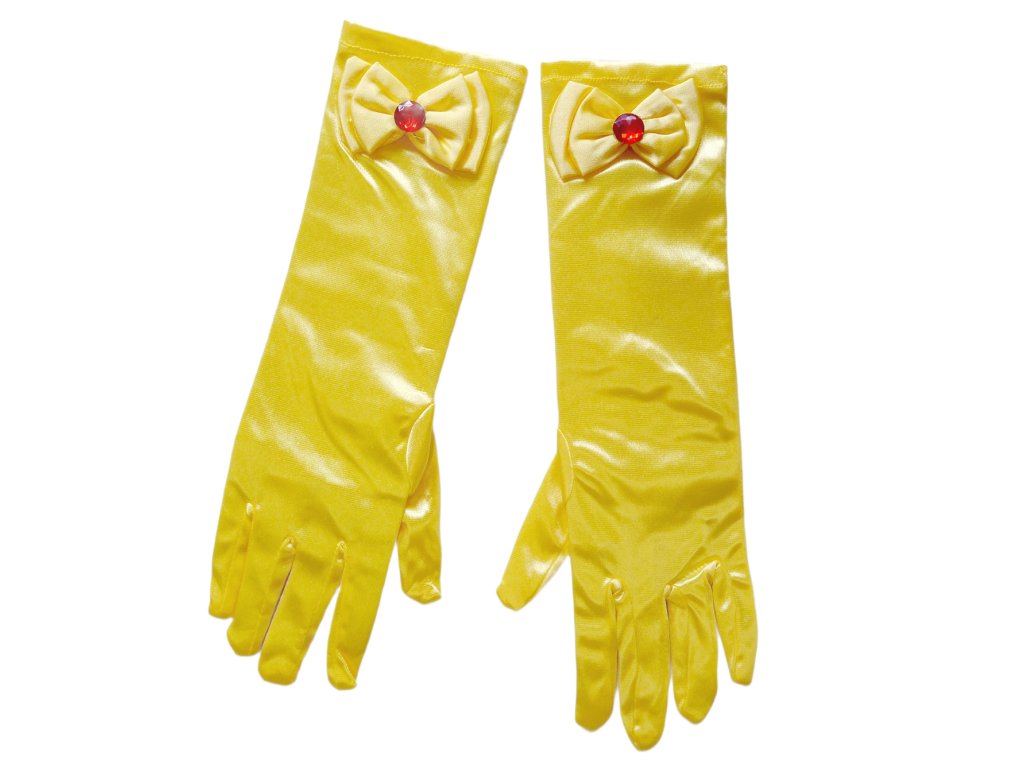 Rukavice siahajúce nad lakeť sú vyrobené z hladkého saténového materiálu a sú zdobené mašličkami s červeným drahokamom, čo celý outfit krásne dopĺňa. Sú príjemné na dotyk a dokonale sedia na detských rukách.