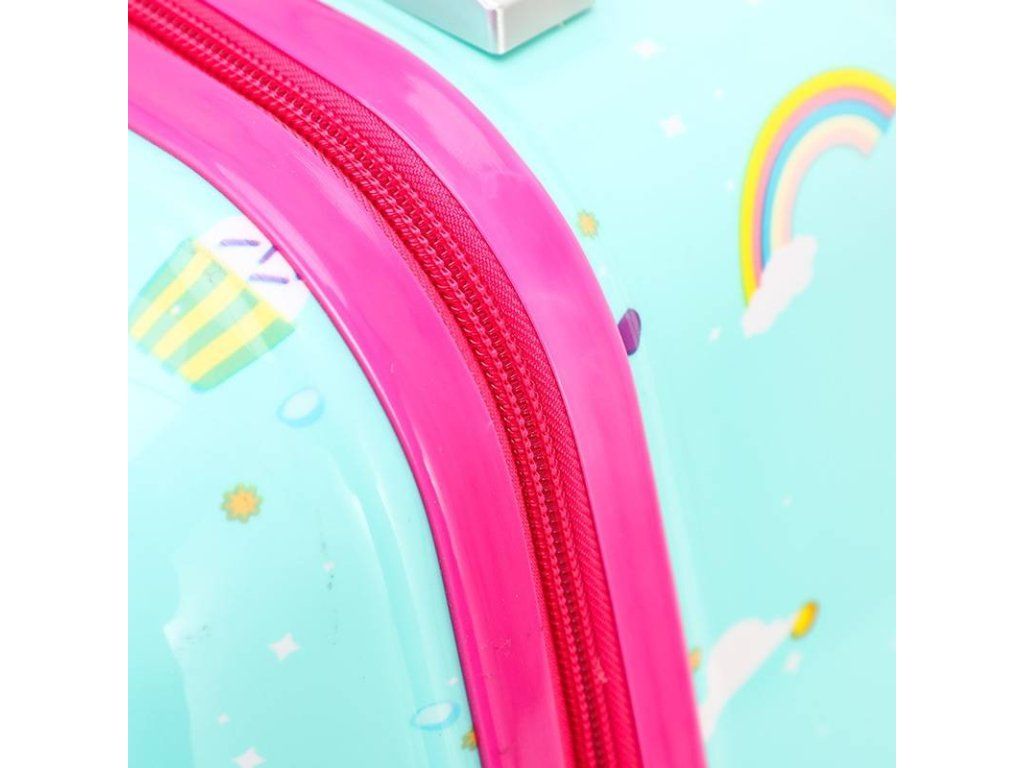 Tento kufor vyniká svojim rozkošným a hravým dizajnom, ktorý zobrazuje detsky štylizovaného jednorožca s dúhovou hrivou a chvostom, sediaceho na obláčiku s dúhou v pozadí. Motív je doplnený srdiečkom a farebným pozadím, kombinujúce svetlo modrej a ružovej farby. Vďaka tomuto očarujúcemu motívu jednorožca nadchne deti a povzbudí ich nadšenie pre cestovanie. Kufor je ideálny pre prázdninové výlety, prespanie u rodiny a kamarátov, školské alebo predškolské akcie. Je nielen praktický, ale aj štýlový a zábavný.