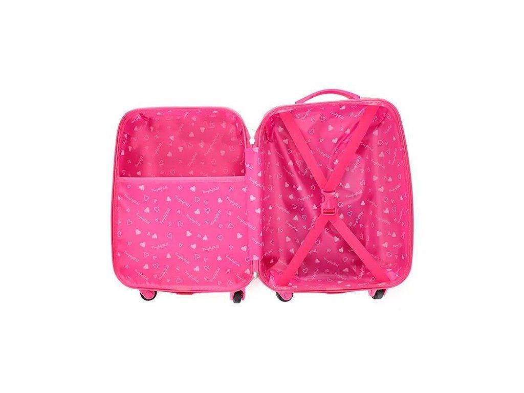 Kufor je vybavený štyrmi hladko otočnými kolieskami, ktoré uľahčujú manipuláciu. Ružová teleskopická rukoväť je ďalším prvkom, ktorý uľahčí používanie kufra a umožní ľahkú manipuláciu aj tým najmenším. Uzatváranie je riešené zipsami z oboch strán, ktoré zaisťujú bezpečné uzavretie a ochranu vecí vo vnútri počas cesty a pri manipulácii s kufrom. Celková konštrukcia je navrhnutá tak, aby spĺňala potreby malých cestovateľov. Vnútorný priestor kufra je vybavený organizérmi a bezpečnostnými pásmi, ktoré pomáhajú udržať všetko na svojom mieste počas cesty. Využíva odolné materiály, ktoré zaisťujú dlhú životnosť a bezproblémové používanie. Kufor je funkčný a bezpečný, ale aj štýlový, čo z neho robí perfektného spoločníka na každú výpravu. Vyrobený je z kvalitného ABS plastu a polykarbonátu, ktoré odolávajú poškodeniu, a jeho povrch chráni tenká priehľadná fólia, ktorú treba pred prvým použitím odstrániť.