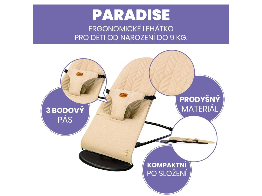 V lehátku PARADISE môže vaše dieťa pohodlne odpočívať, zatiaľ čo vy si môžete v pokoji vychutnať svoju šálku kávy. Priedušný, pohodlný materiál je šetrný k jemnej pokožke dieťaťa, navyše poťah možno v prípade potreby odňať a vyprať. Lehátko sa dá zložiť do veľmi kompaktných rozmerov, takže nezaberie veľa miesta a môžete ho vziať všade so sebou.
