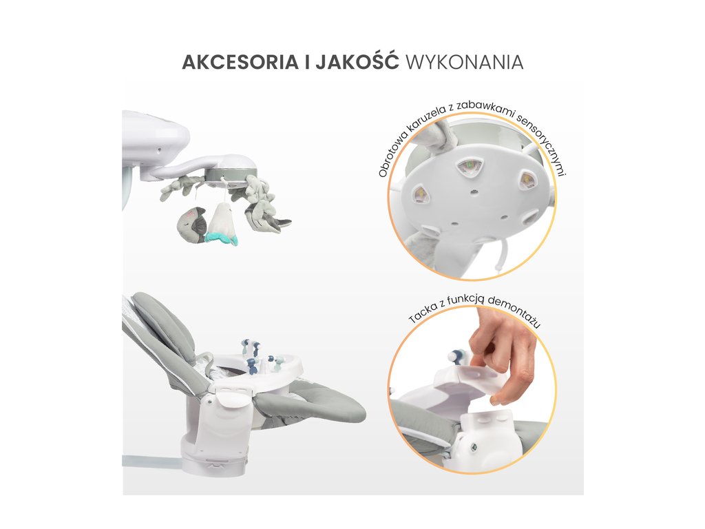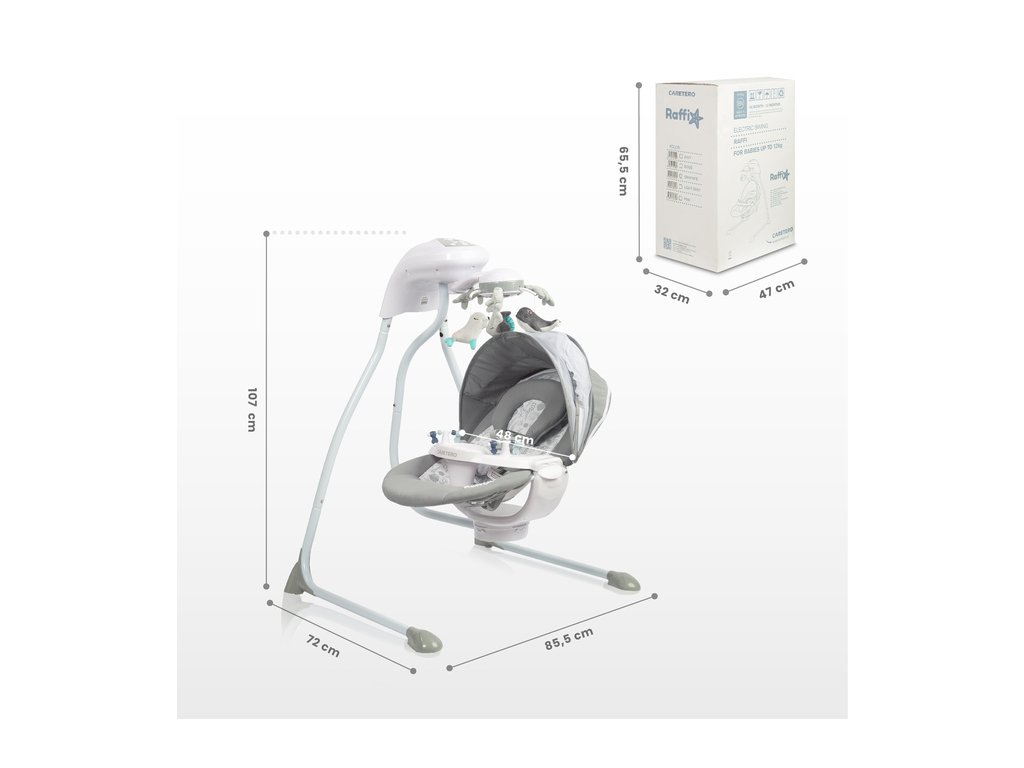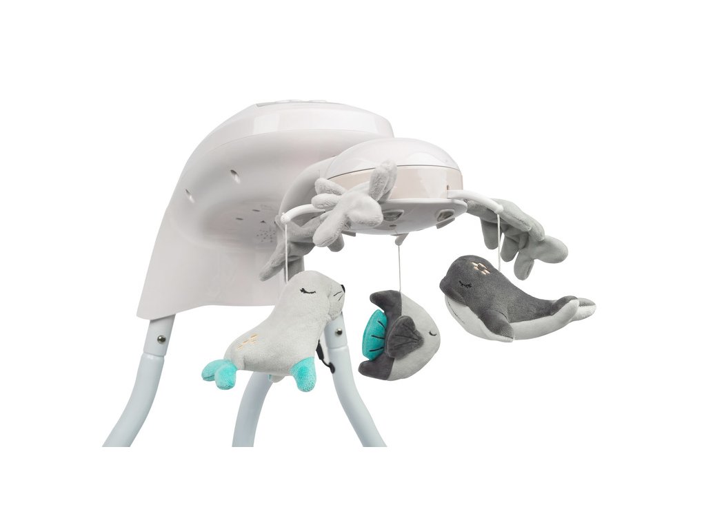 Otočný kolotoč s hračkami a svetlami s morskou tematikou púta pozornosť dieťaťa a podporuje rozvoj jeho motorických zručností. Odnímateľný podnos uľahčuje starostlivosť o bábätko. Vysokokvalitné materiály a široká škála funkcií robia z hojdačky Raffi vynikajúcu voľbu pre každé bábätko.