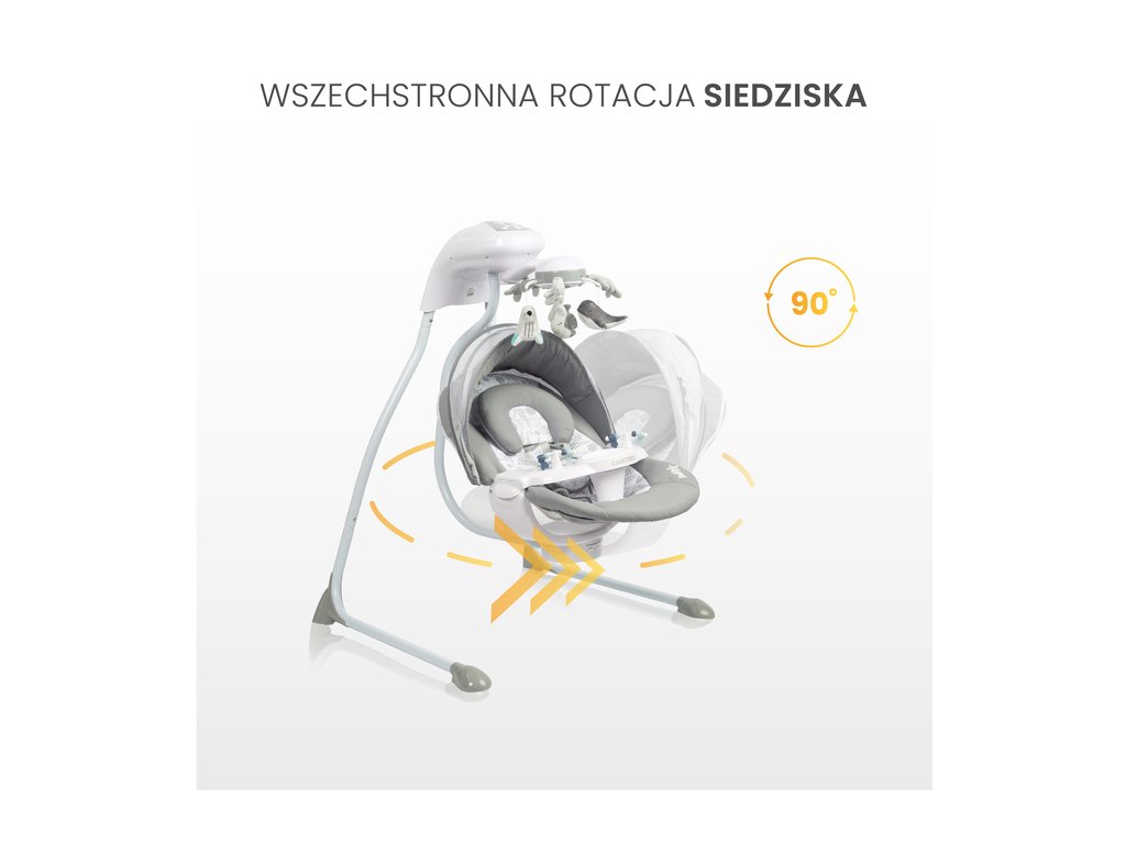 Sedadlo sa dá otočiť o 90 stupňov doľava alebo doprava, čo umožňuje meniť smer hojdania zo strany na stranu alebo spredu dozadu.