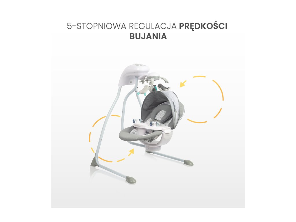 Môžete si vybrať z piatich rýchlostí hojdania, aby ste prispôsobili pohyb hojdačky potrebám dieťaťa a ponúkli jemné alebo intenzívnejšie hojdanie. Časovač umožňuje automatické vypnutie zariadenia po 8, 15 alebo 30 minútach.