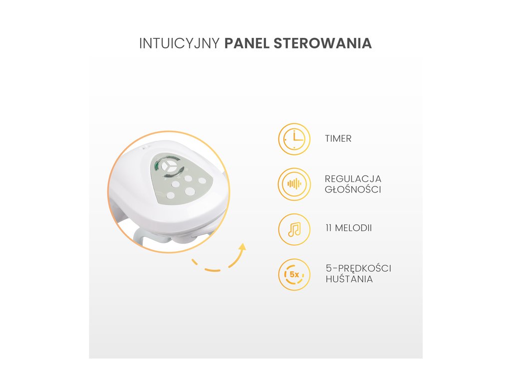 Ovládací panel ponúka 5 nastavení rýchlosti a nastavenie časovača. Hojdačka ponúka 11 melódií a zvukov prírody vrátane tečúcej vody a spevu vtákov, ktoré pomáhajú pri relaxácii a zaspávaní.