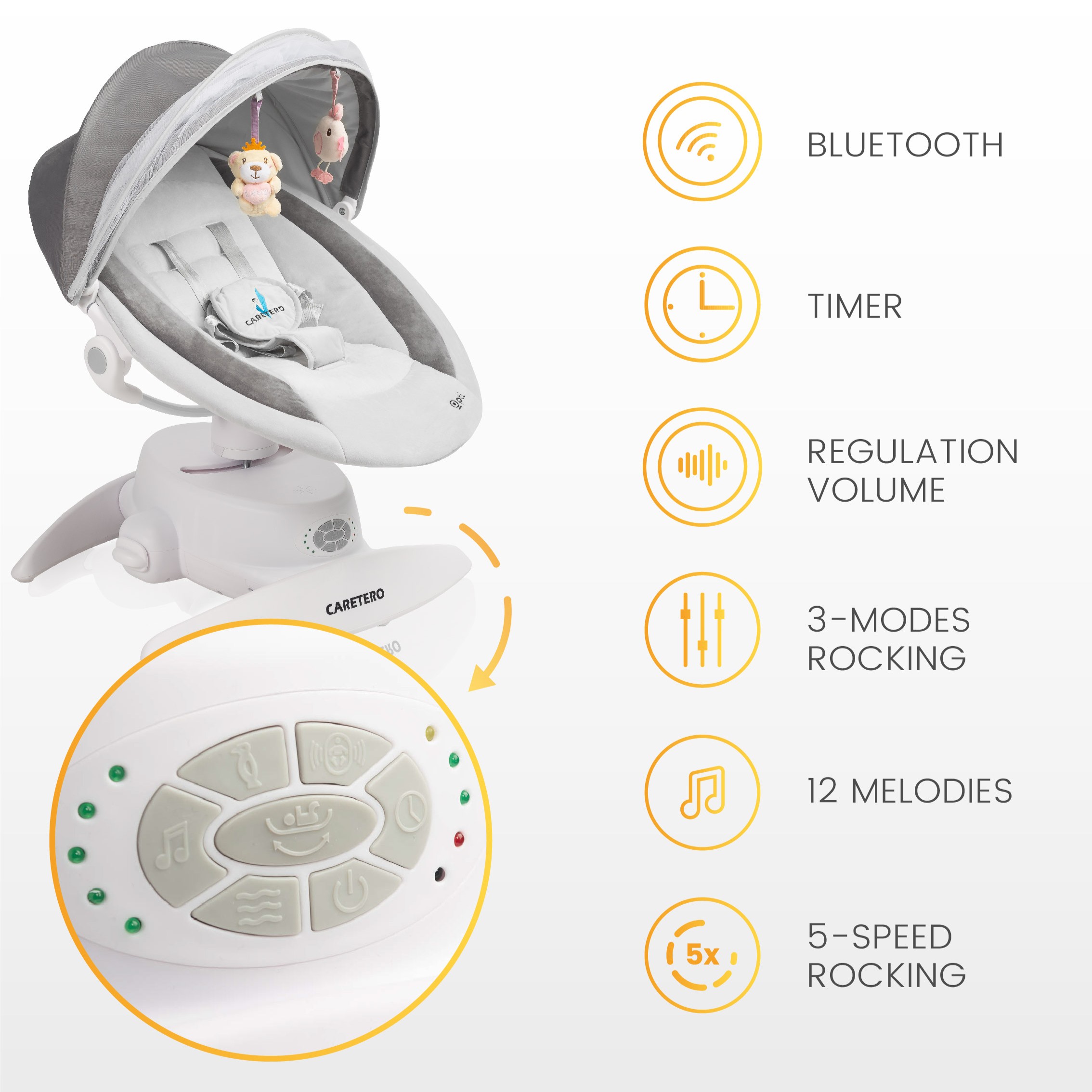 5-stupňové nastavenie a vstavaný časovač umožňujú dokonalé prispôsobenie zariadenia potrebám dieťaťa. Hojdačka ponúka 11 melódií a režimov so zvukmi vody a spevom vtákov, ktoré podporujú relaxáciu a uľahčujú zaspávanie. Súčasťou balenia je diaľkové ovládanie, ktoré umožňuje pohodlné ovládanie na diaľku.