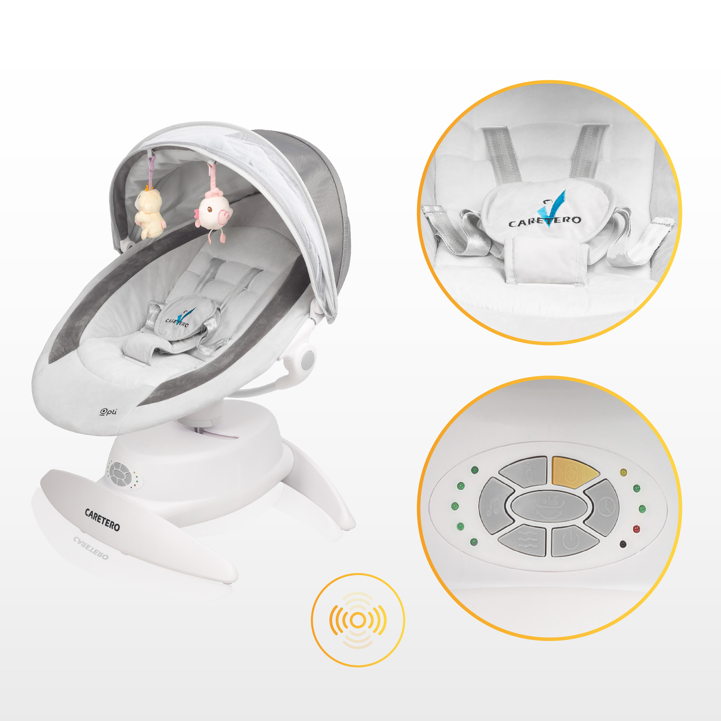 S dôrazom na bezpečnosť najmenších je Opti vybavený bezpečnostnými pásmi, ktoré zabraňujú vypadnutiu dieťaťa z hojdačky. Režim detekcie pohybu navyše automaticky aktivuje zariadenie, keď zaznamená, že sa dieťa začína pohybovať.