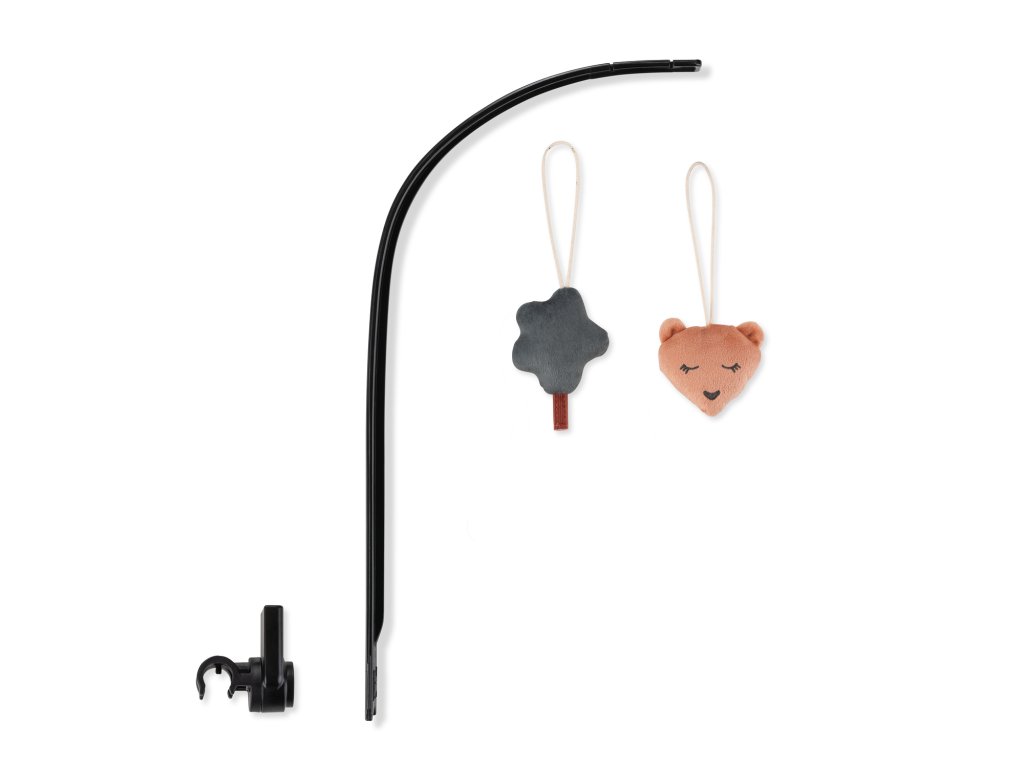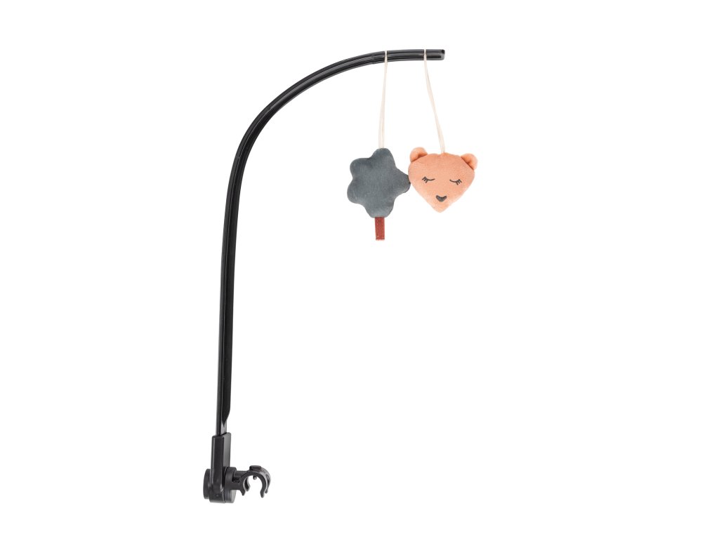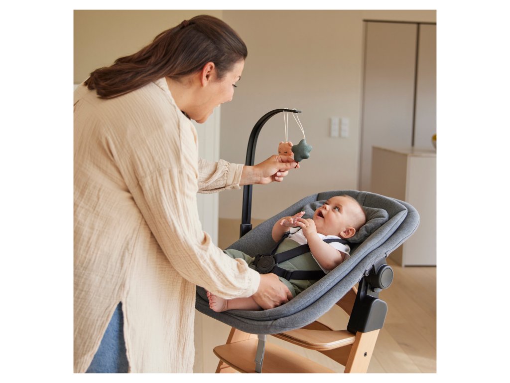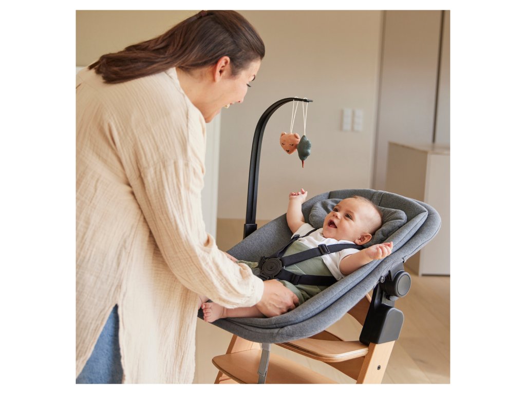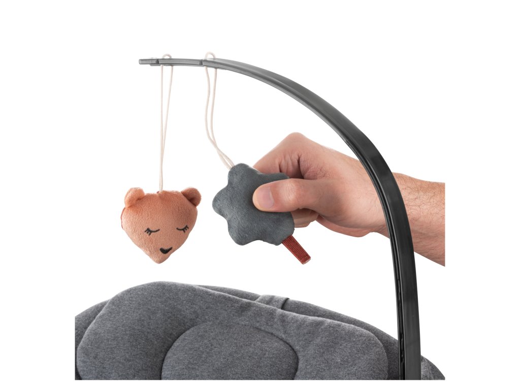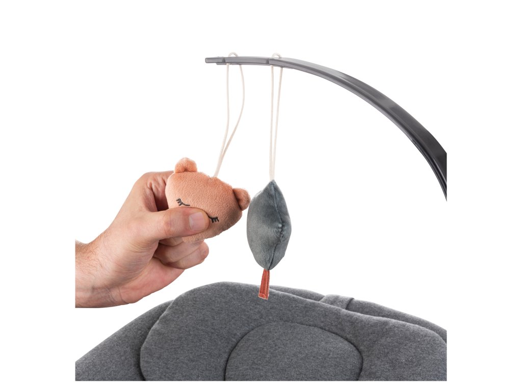 Hrací oblúk je možné pripevniť k obom stranám kresielka bez nutnosti použitia akéhokoľvek nástroja a rovnako tak ho možno v prípade potreby ľahko odňať. Oblúk je možné polohovať do 5 pozícií, môžete tak ľahko priblížiť alebo oddialiť hračky alebo si urobiť viac miesta na uloženie dieťatka.
