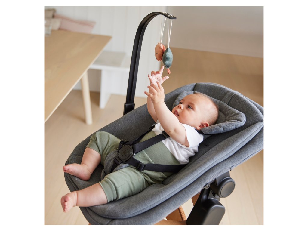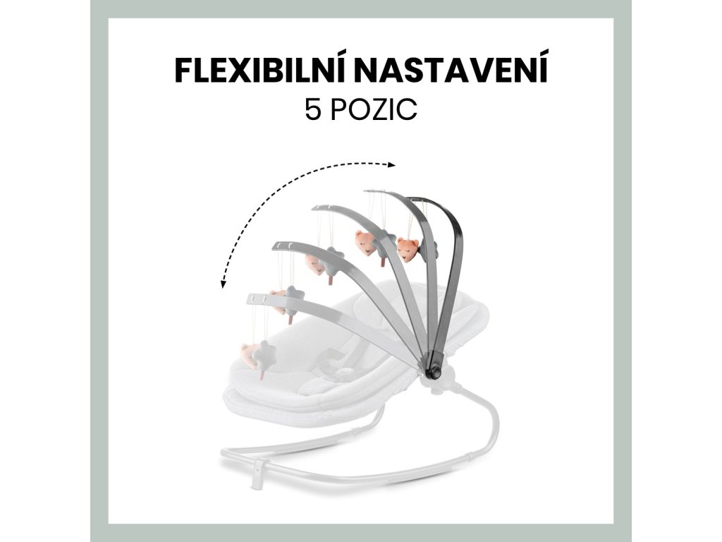 FLEXIBILNÉ NASTAVENIE // Hrací oblúk je možné jednoducho polohovať do jednej z piatich pozícií podľa vašej potreby. Závesné hračky tak môžu byť bližšie alebo ďalej. Rovnako tak vám polohovacia hrazda poskytne viac miesta na uloženie vášho dieťatka do kresielka.