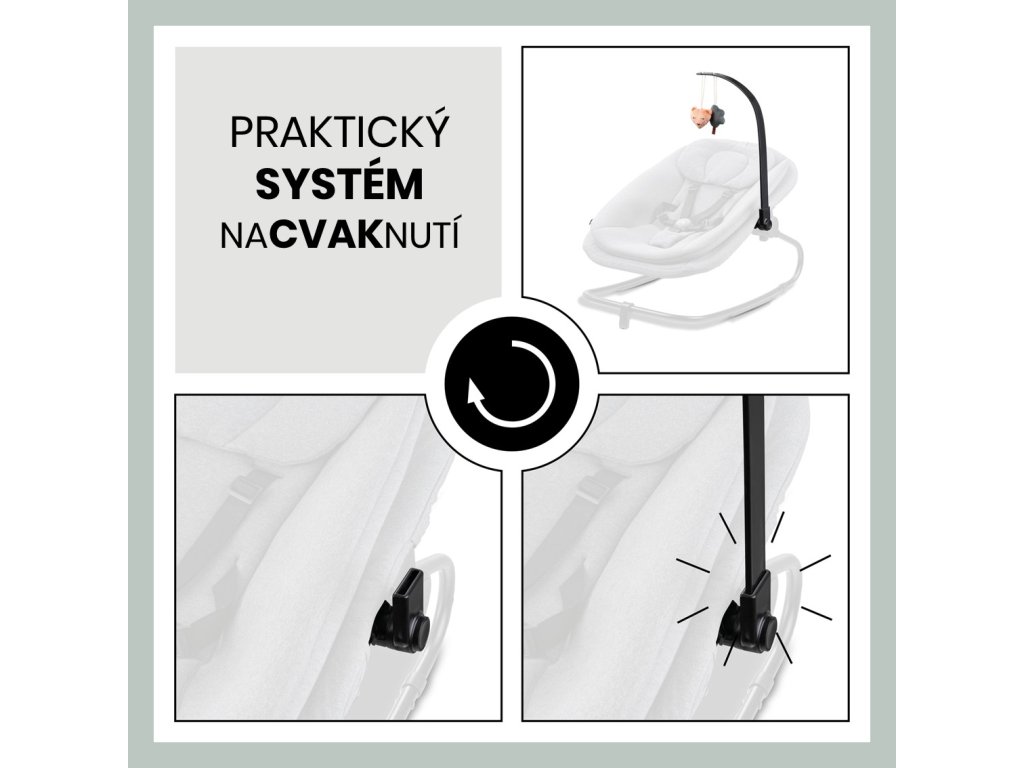 PRIPEVNENÉ ĽAHKO A RÝCHLO // Hrací oblúk je možné pripevniť na obe strany kresielka bez potreby použitia akéhokoľvek nástroja a rovnako tak rýchlo ho možno opäť odstrániť.