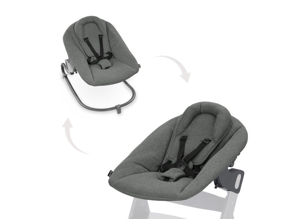 Z VYSOKEJ STOLIČKY DO LEŽADLA POČAS CHVÍĽKY // Vďaka prídavnému rámu môžete už počas chvíľočky zmeniť nadstavec na stoličku na pohodlné ležadlo. Ak máte doma malého nezbedníka, jednoducho sklopte nožičky rámu a maličký sa môže sám pohupovať dopredu a dozadu, v rytme hojdania svojich nožičiek.