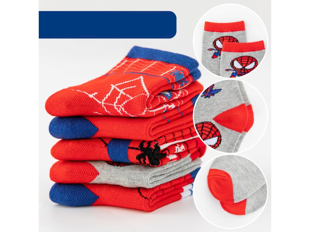 V balení nájdete 5 rôznych párov ponožiek s veselými a farebnými motívmi ako sú pavučiny, maska Spidermana alebo s nápisom. Ponožky sú vyrobené z príjemného a pružného materiálu, ktorý zabezpečí pohodlie počas celého dňa. Elastický lem dobre drží na nohe a zároveň netlačí. Kombinácia červenej, modrej a sivej farby z nich robí zábavný doplnok na doma, do škôlky aj na von.