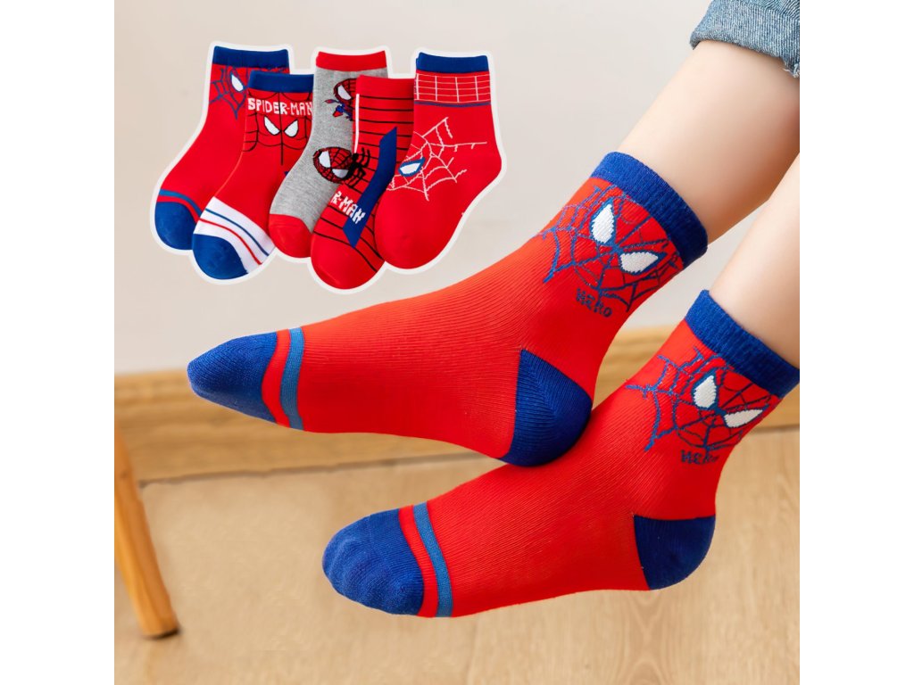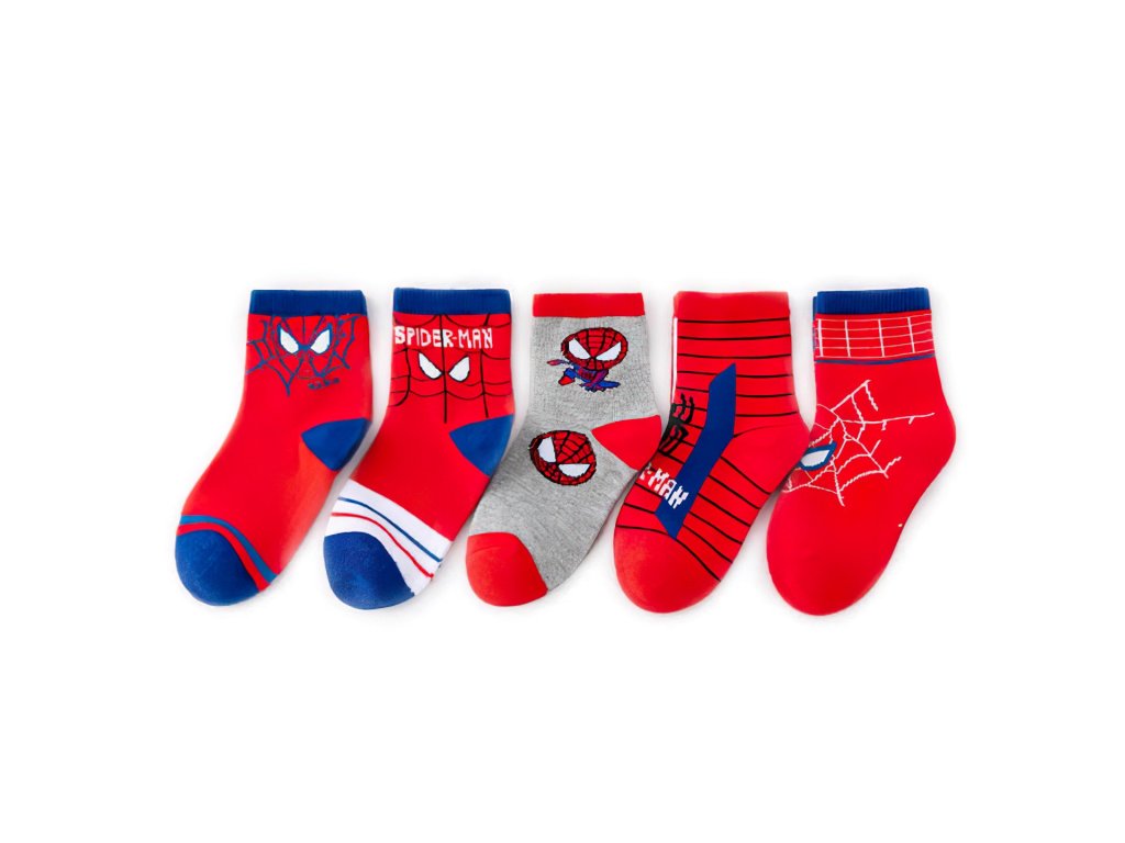 V balení nájdete 5 rôznych párov ponožiek s veselými a farebnými motívmi ako sú pavučiny, maska Spidermana alebo s nápisom. Ponožky sú vyrobené z príjemného a pružného materiálu, ktorý zabezpečí pohodlie počas celého dňa. Elastický lem dobre drží na nohe a zároveň netlačí. Kombinácia červenej, modrej a sivej farby z nich robí zábavný doplnok na doma, do škôlky aj na von.