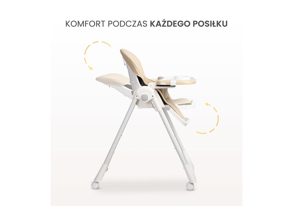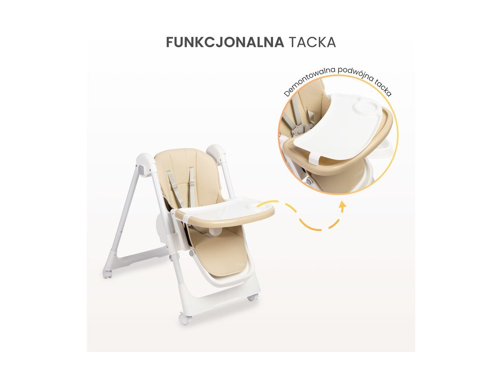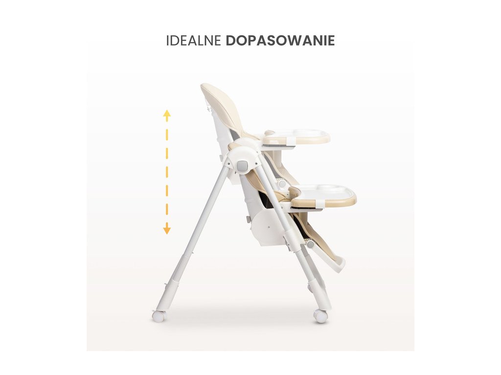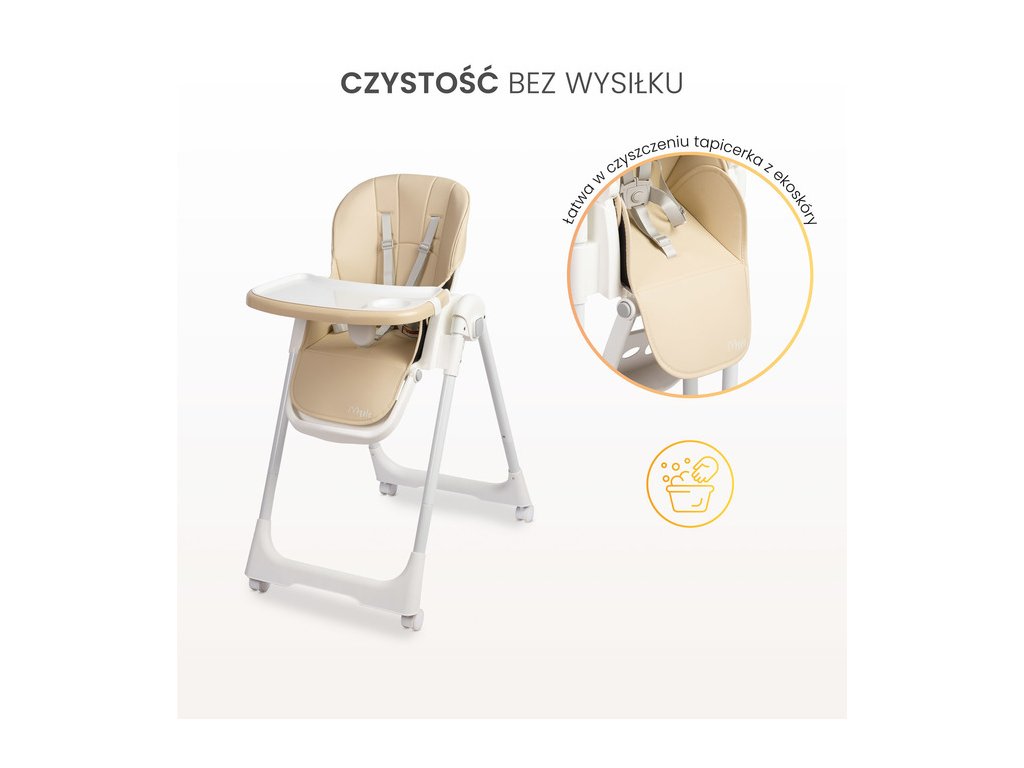 Skladacia stolička na kŕmenie Megalo je ľahká a pohodlná. Nízka hmotnosť a pohodlie vďaka možnosti zloženia na malú veľkosť sú silnou stránkou produktu. Priestranná sedačka s nastaviteľnou vaničkou a bezpečnostnými pásmi zaisťujú, že vaše dieťatko môže pohodlne jesť. Sedačka je potiahnutá čalúnením z ekokože, ktorá sa dá ľahko vybrať a vyčistiť. Nastaviteľná výška stoličky vám umožní zvoliť si optimálne nastavenie v závislosti od vašich potrieb. Megalo má pogumované kolieska s aretáciou, vďaka čomu sa dá ľahko presúvať bez poškodenia podlahy.