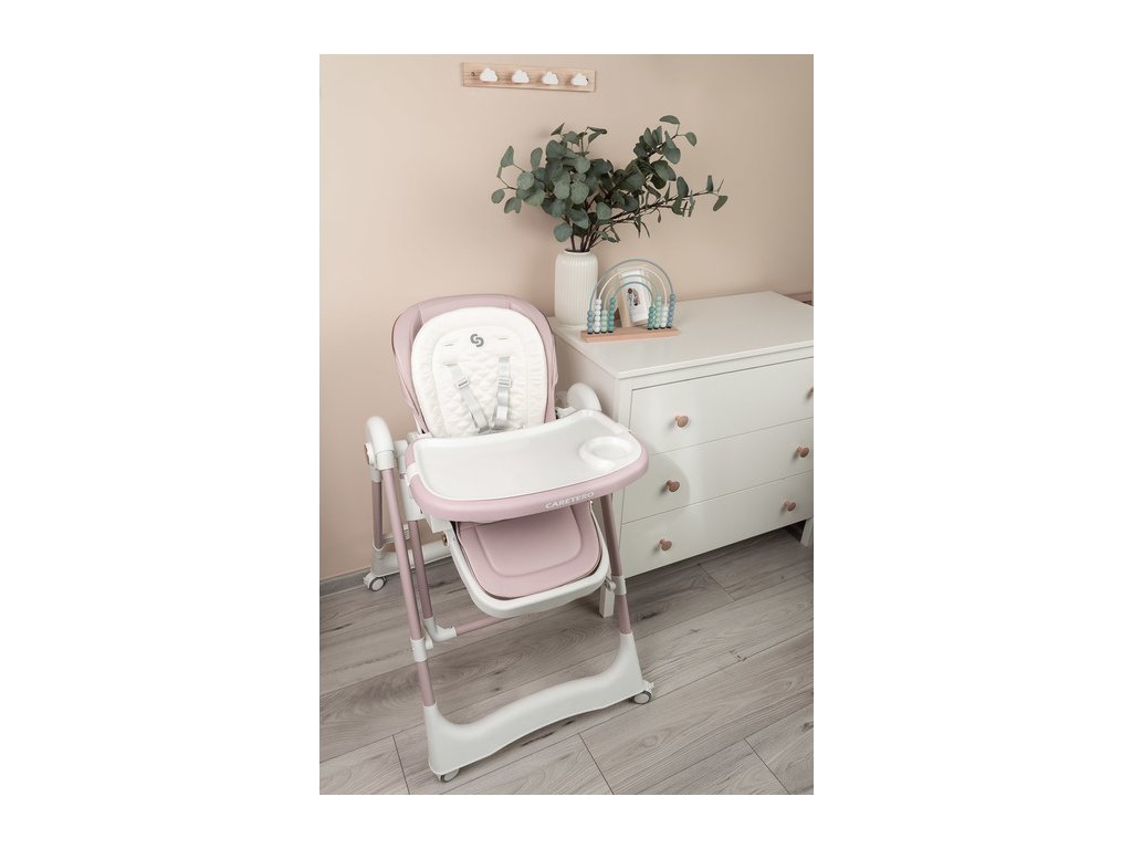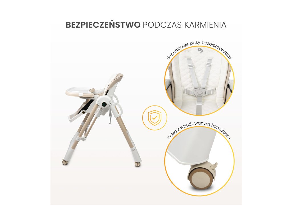 Detská stolička je vybavená 5-bodovým bezpečnostným pásom, ktorý účinne zaisťuje vaše dieťa počas každého jedla. Aretačné kolieska umožňujú jednoduchý pohyb a po zastavení stoličku bezpečne zaistia na mieste.