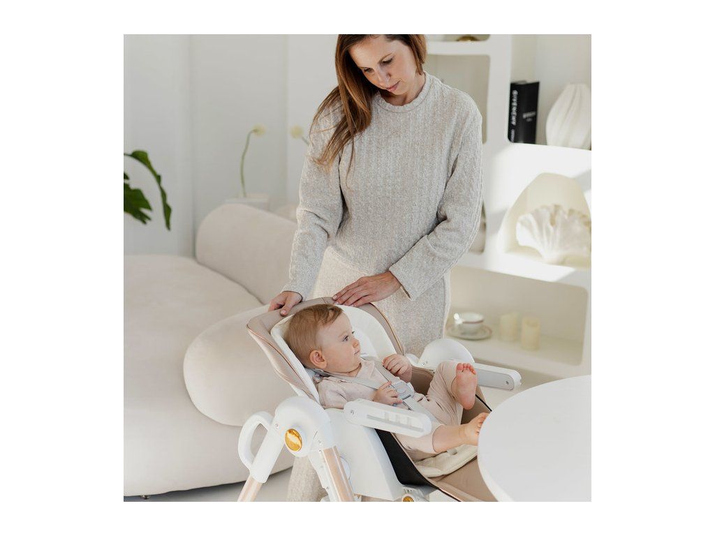 Čalúnenie z eko kože zaisťuje pohodlie a jednoduché čistenie – stačí utrieť povrch vlhkou handričkou, aby ste odstránili každodenné škvrny. Stolička je vybavená ďalším mäkkým vankúšom, ktorý poskytuje ideálnu oporu a pohodlie počas každého jedla. Odnímateľná vrchná vrstva tácky, ktorú je možné rýchlo vybrať a dôkladne umyť, je ideálna na udržiavanie hygieny po každom jedle.