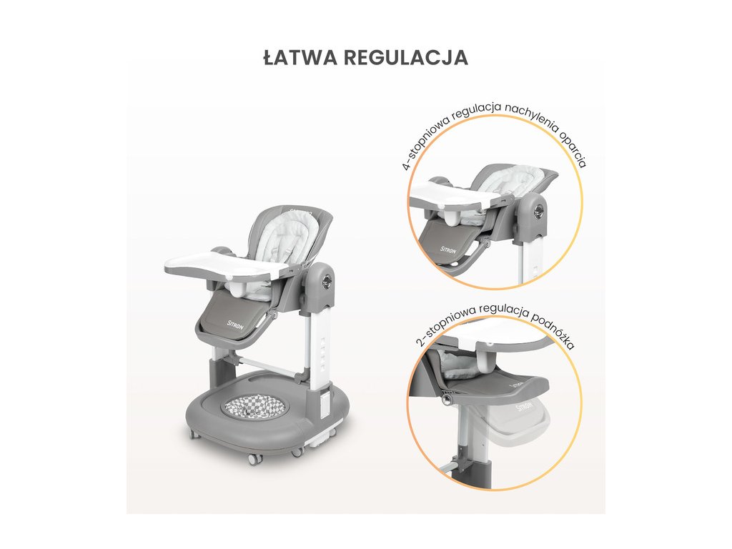 Detská jedálenská stolička je navrhnutá tak, aby sa prispôsobila potrebám vášho dieťaťa v každej fáze vývoja. Operadlo sa dá nastaviť do 4 polôh, vďaka čomu je ideálne na kŕmenie aj odpočinok. 5-polohové nastavenie výšky sedadla umožňuje dokonalé usadenie pri stole a nastaviteľný rozstup medzi táckami zaisťuje pohodlie a slobodu počas jedla.