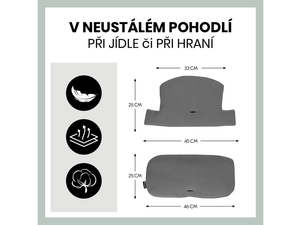 SKUTOČNÉ POHODLIE PRI STOLOVANÍ AJ PRI HRANÍ // Polstrovanie z priedušnej bavlny ponúka úžasne mäkučký set na drevené stoličky. Extra polstrovaný chrbát poskytuje dieťatku skutočné pohodlie pri stolovaní aj pri hraní.