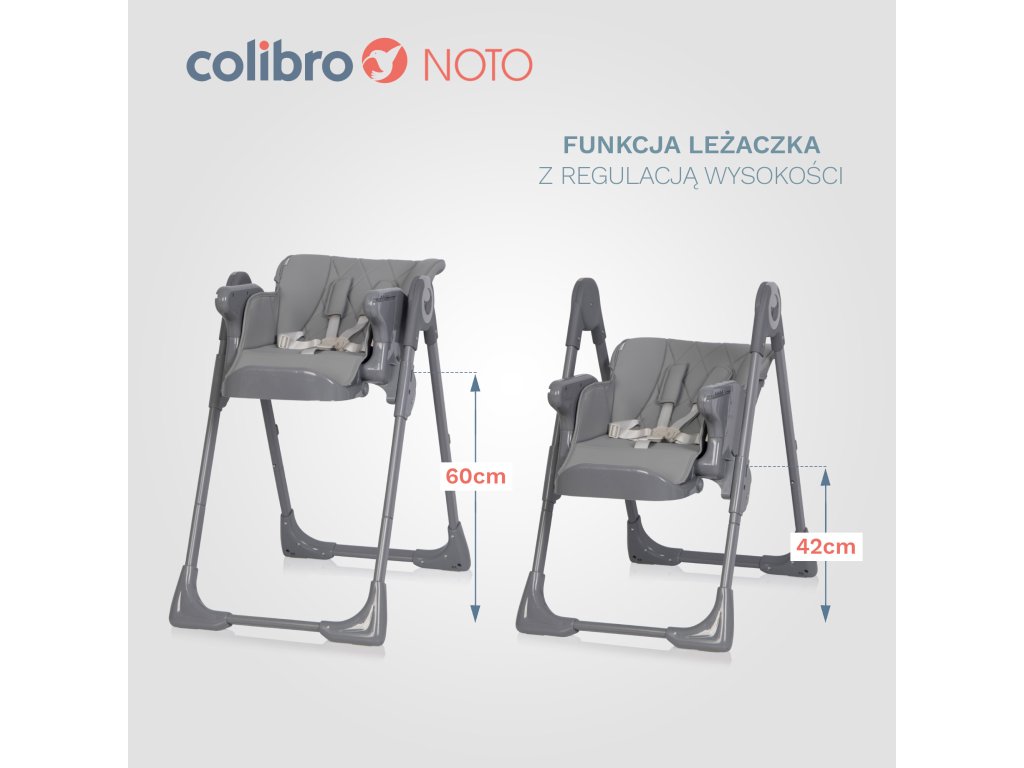 Multifunkčnosť: Colibro Noto slúži nielen ako jedálenská stolička, ale aj ako lehátko pre dieťa. Vďaka siedmim nastaveniam výšky môžete stoličku jednoducho prispôsobiť výške stola alebo ju zložiť pre ľahké uskladnenie.