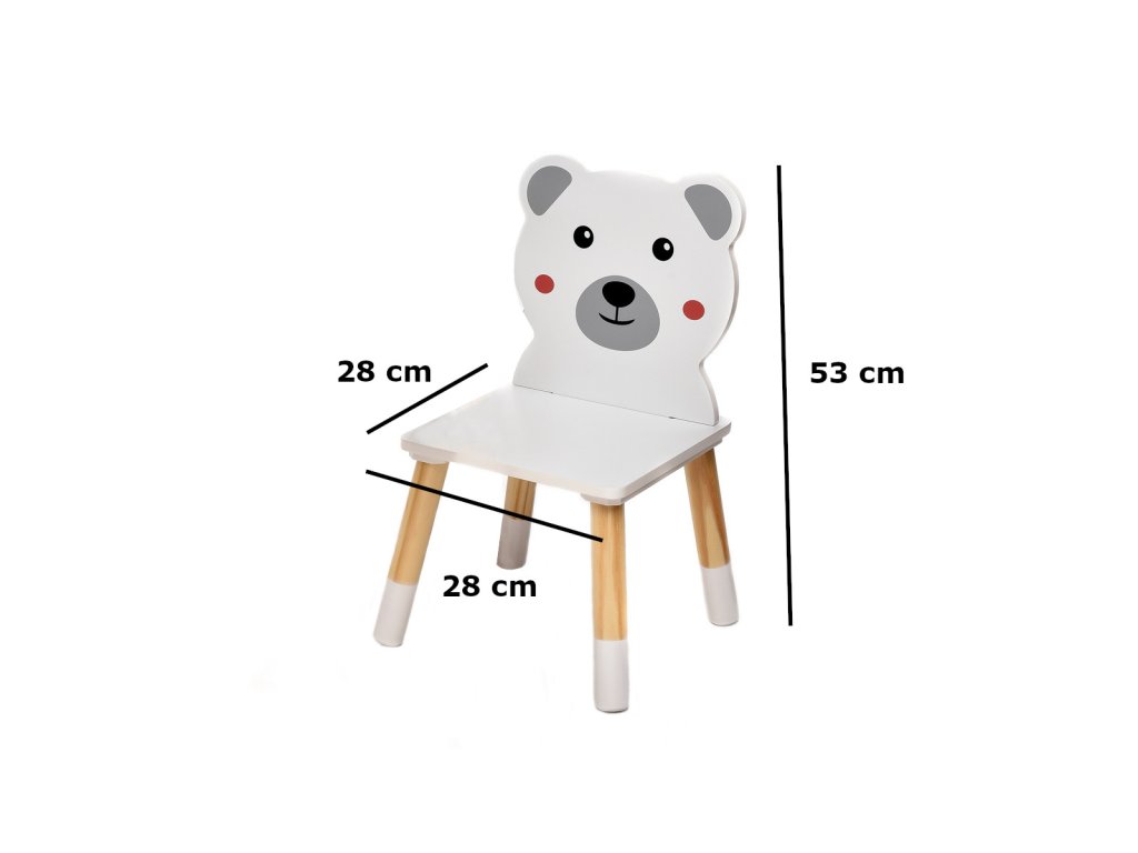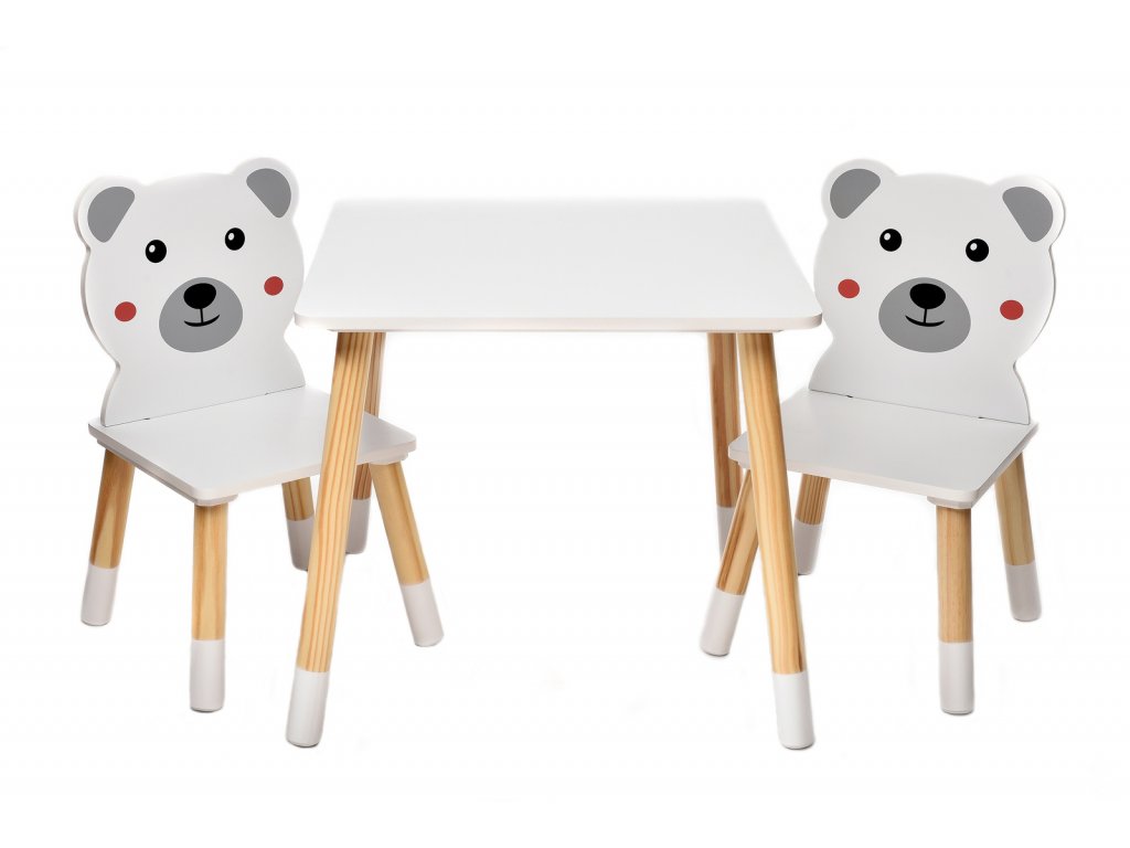 Nádherný detský stôl v bielom prevedení so stoličkami s motívom medvedíkov. Stolček je ideálnym miestom pre hranie, maľovanie, občerstvenie alebo pre posedenie s kamarátmi. Originálny doplnok do detskej izby, praktický, prispôsobený detským potrebám. Nábytok je stabilný, ľahko sa čistí.