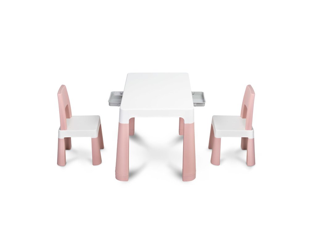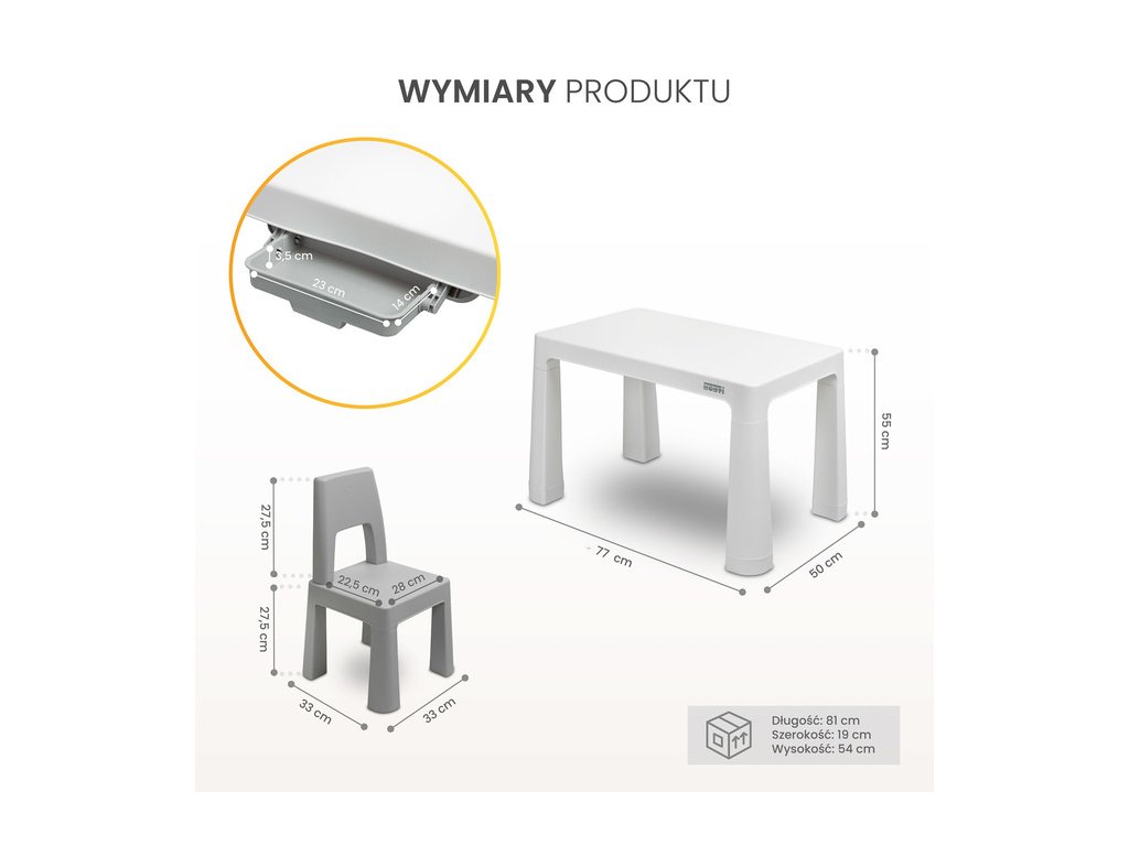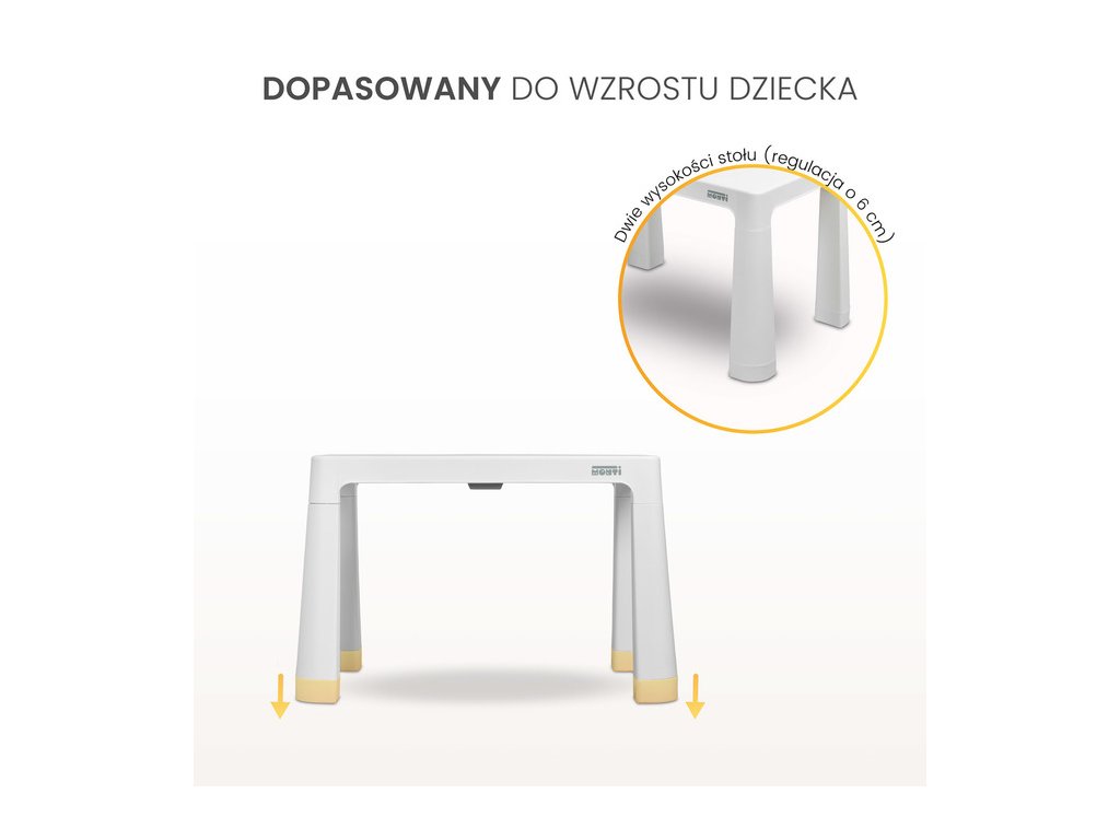 Monti je všestranný detský stôl so stoličkami. S jeho pomocou si ľahko vytvoríte kútik na umeleckú tvorbu alebo zábavu doma aj vonku. Súprava je vyrobená z kvalitného plastu - bezpečného a odolného voči rôznym rozmarom počasia a divokým hrám. Stôl a stoličky sú ľahké, takže ich dieťa môže prenášať samo. Vďaka jednoduchému dizajnu sa Monti dá ľahko zostaviť - stačí stlačiť prvky k sebe. Stôl má 2 zásuvky, ktoré sa skrývajú pod doskou stola, a je tiež možné znížiť výšku o 6 cm.