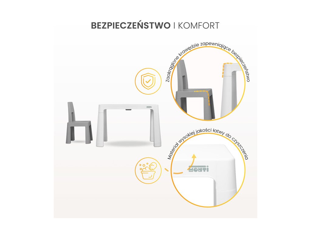 Nábytok je vyrobený z ľahko čistiteľných materiálov, vďaka čomu sa jednoducho udržiava čistota po jedle a hre. Stôl je pevný a ergonomicky navrhnutá stolička podporuje správne držanie tela dieťaťa. Zaoblené hrany zvyšujú bezpečnosť počas hry.