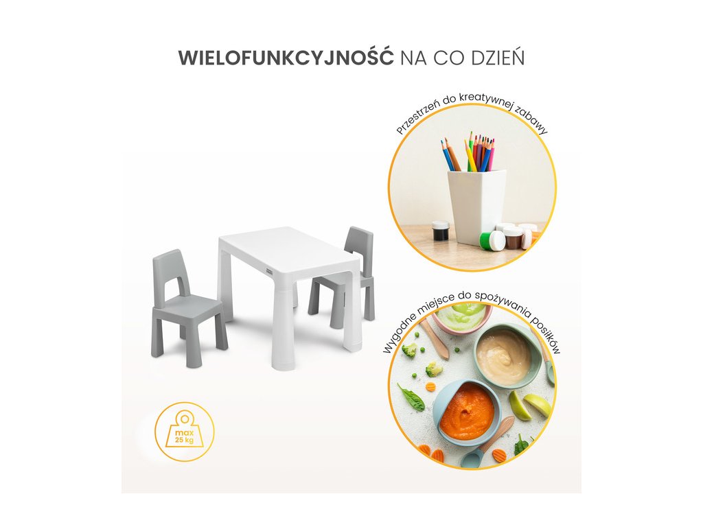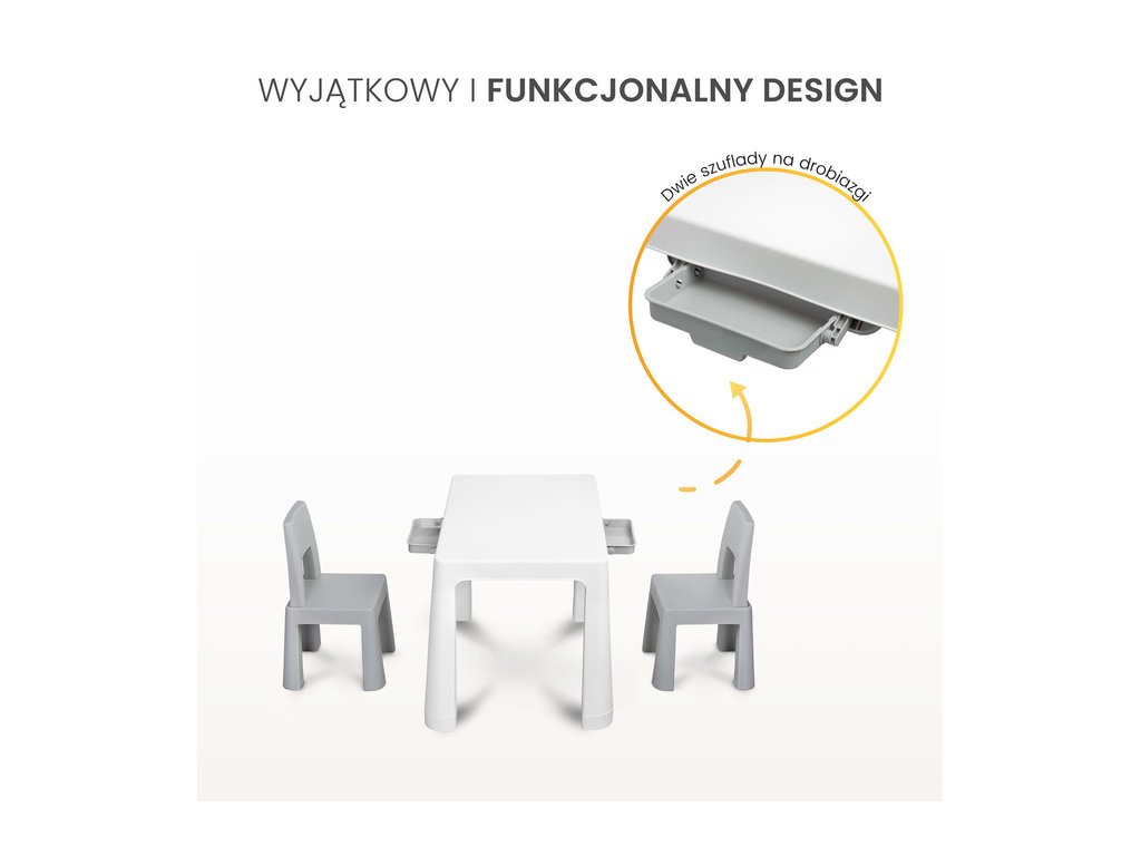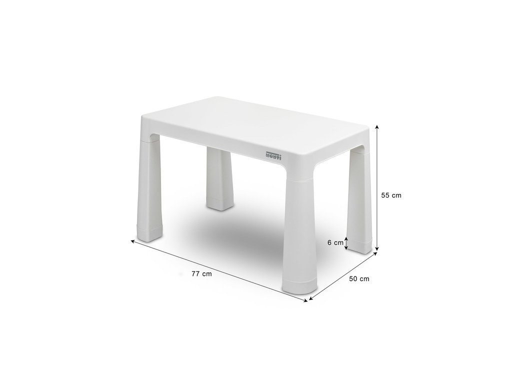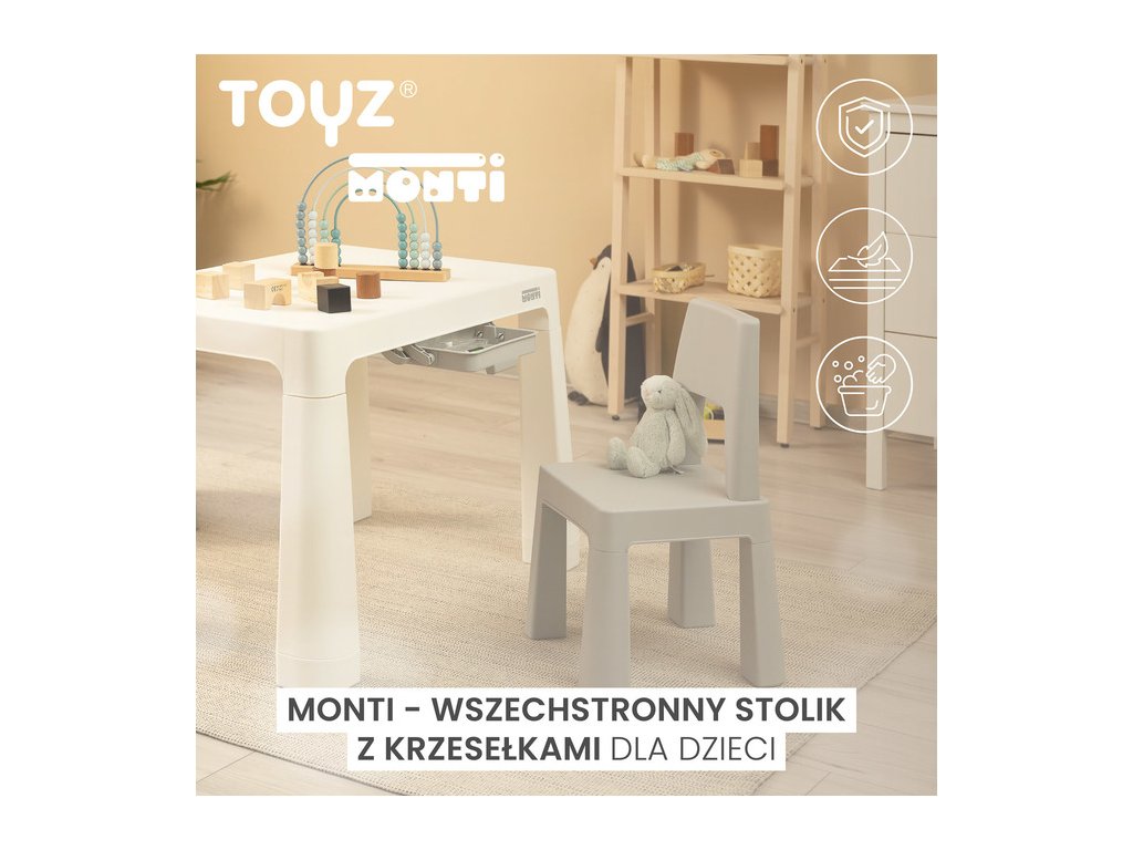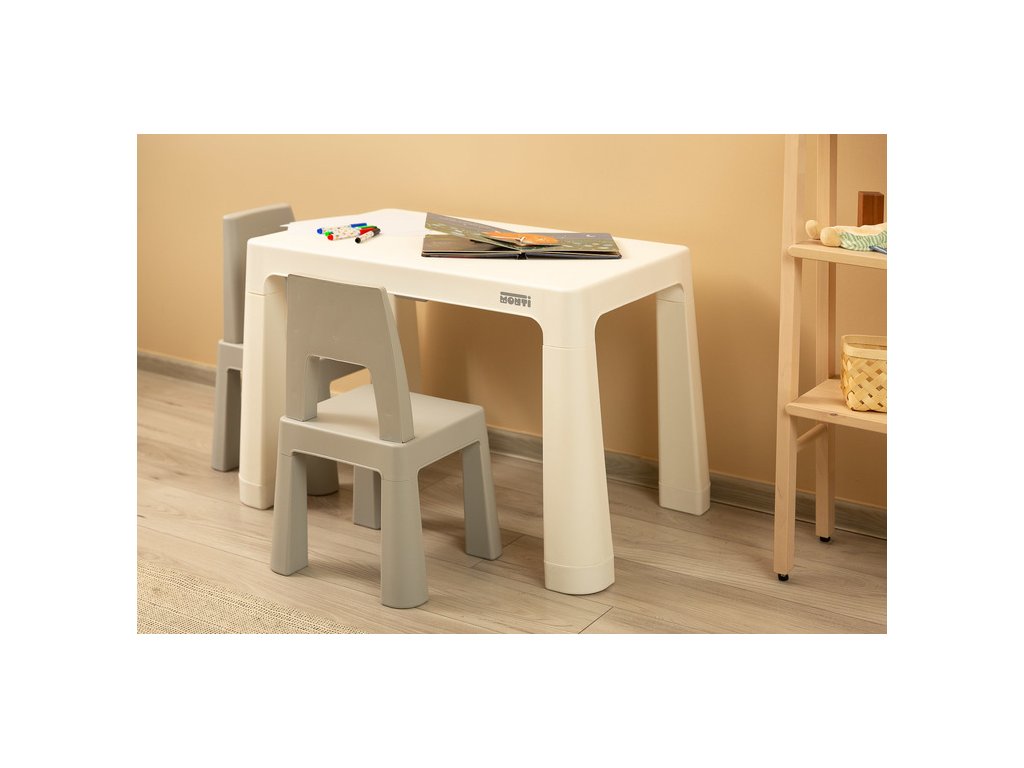 Monti je všestranný detský stôl so stoličkami. S jeho pomocou si ľahko vytvoríte kútik na umeleckú tvorbu alebo zábavu doma aj vonku. Súprava je vyrobená z kvalitného plastu - bezpečného a odolného voči rôznym rozmarom počasia a divokým hrám. Stôl a stoličky sú ľahké, takže ich dieťa môže prenášať samo. Vďaka jednoduchému dizajnu sa Monti dá ľahko zostaviť - stačí stlačiť prvky k sebe. Stôl má 2 zásuvky, ktoré sa skrývajú pod doskou stola, a je tiež možné znížiť výšku o 6 cm.