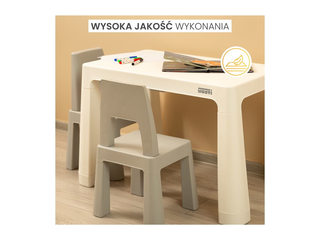 Sada nábytku je vyrobená z vysoko kvalitného plastu, ktorý je bezpečný, odolný voči poškriabaniu a ľahký. Vďaka tomu môže dieťa jednoducho premiestniť stôl a stoličky na akékoľvek miesto.