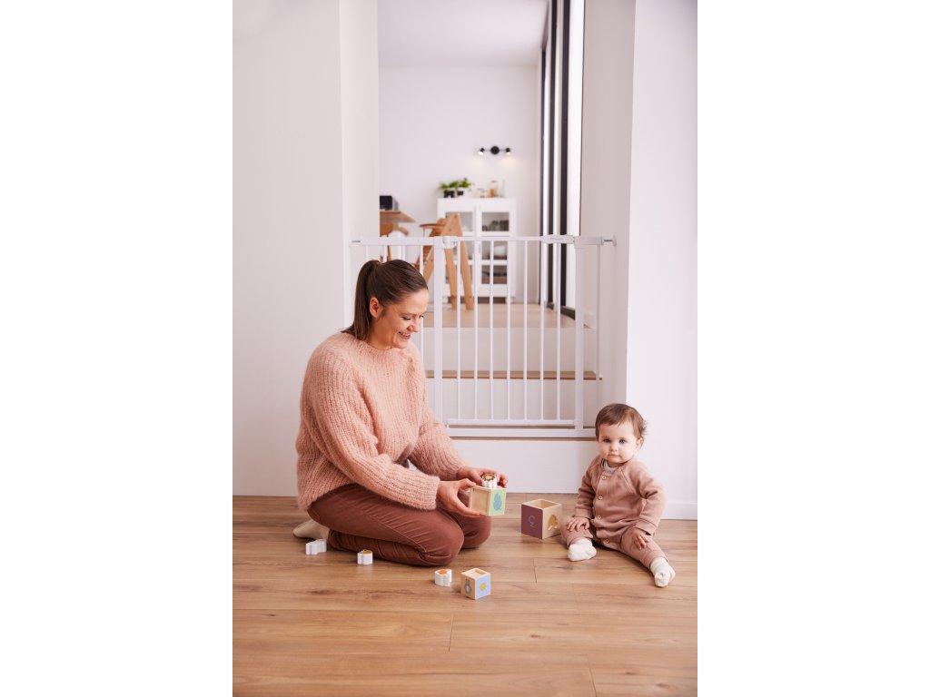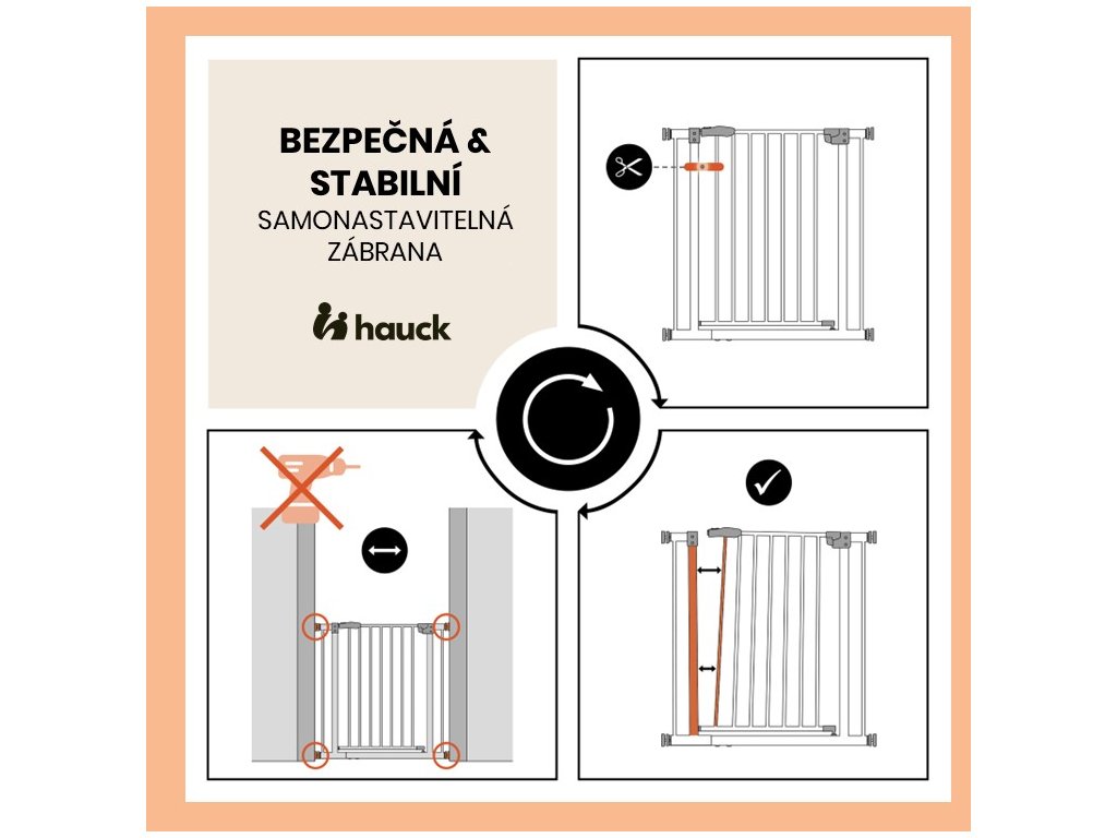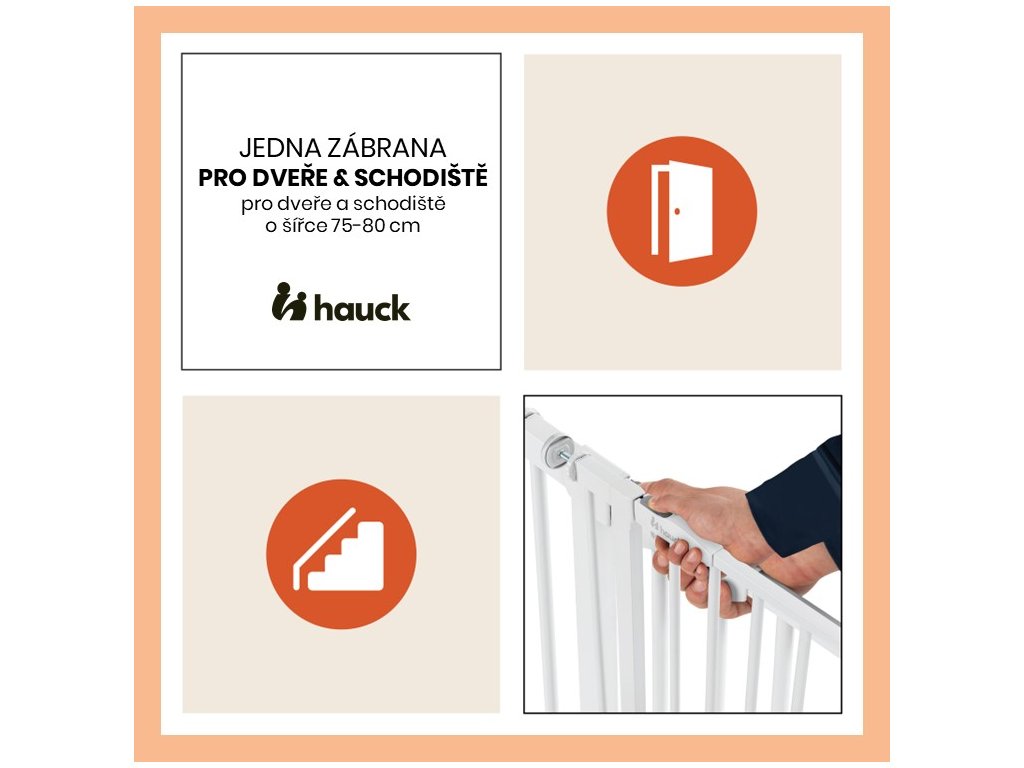 Či už doma, u starých rodičov alebo na dovolenke, zábrana sa jednoducho upevní na rám dverí, na zábradlie alebo len na stenu pomocou nastaviteľných skrutiek. Vďaka nim sa zábrana ľahko upevní a opäť odstráni bez zanechania akýchkoľvek stôp. Zábranu možno ľahko otvoriť jednou rukou na oboch stranách a opäť ľahko zatvoriť.